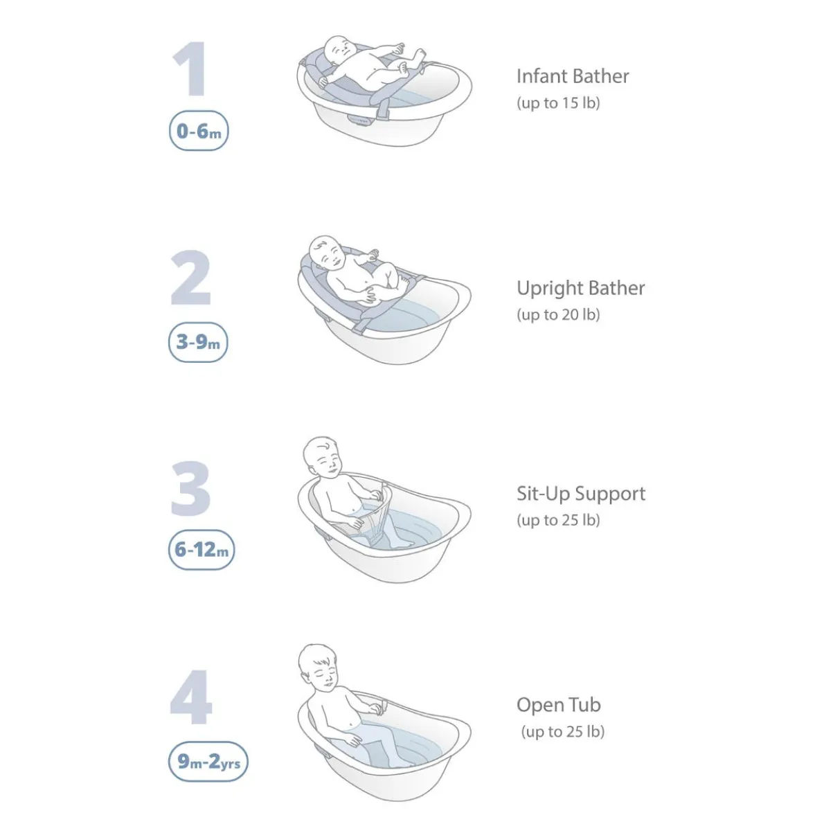 - 4 Grow-With-Baby Stages: Infant Bather (0-6m; up to 15 lbs/7 kg; Upright Bather (3-9m; up to 20 lbs/9 kg); Sit-up Support (6-12m; up to 25 lbs/11,5 kg); Open Tub (9m-2yrs; up to 25 lbs/11,5 kg)