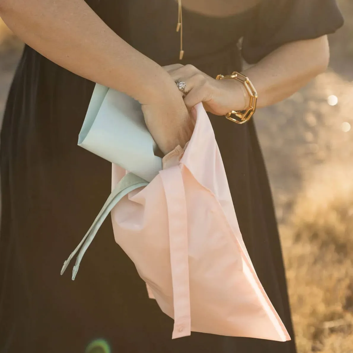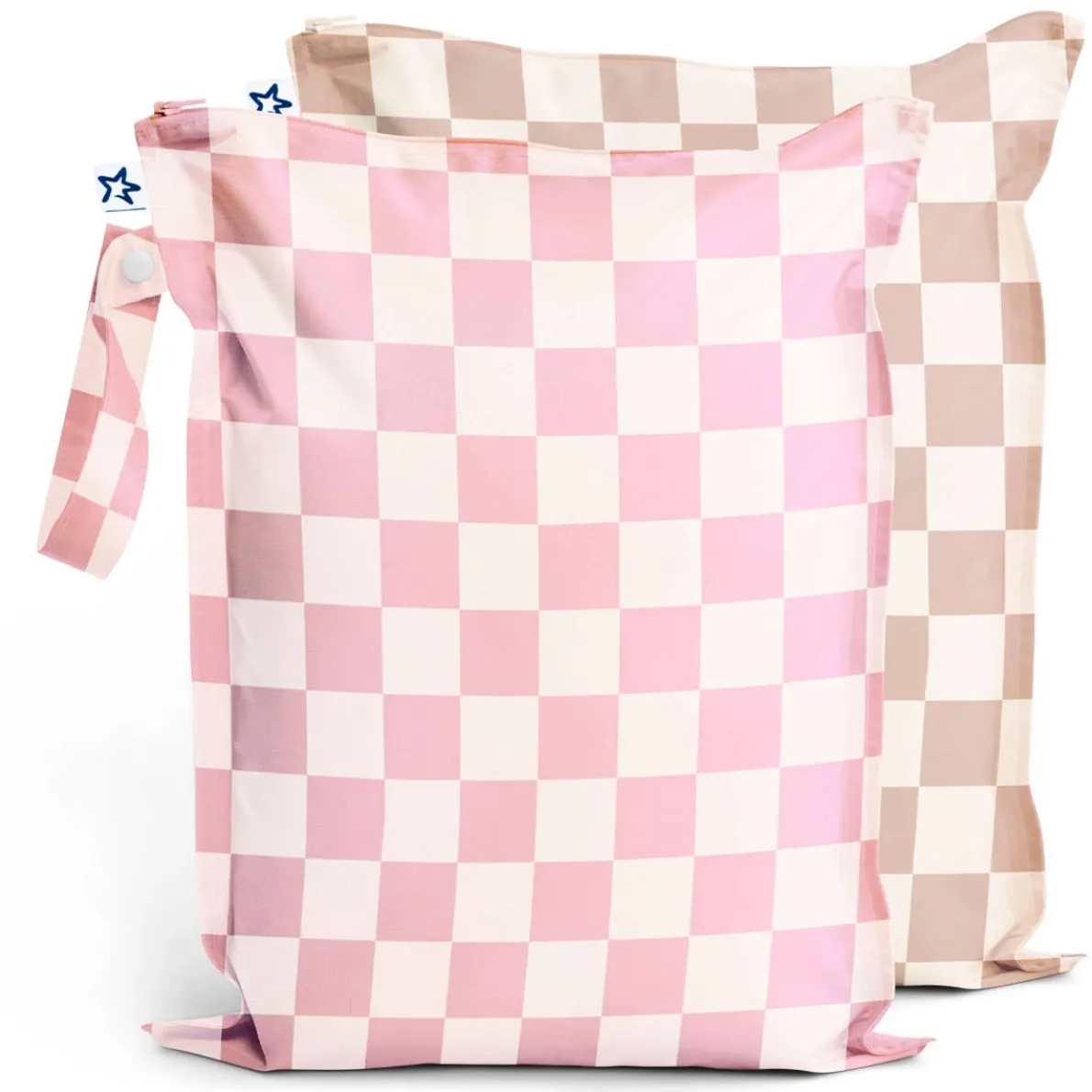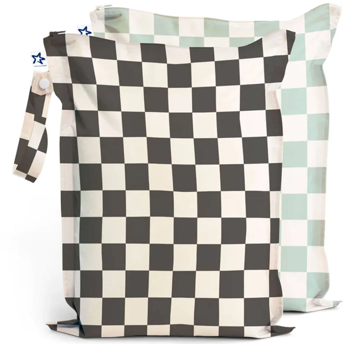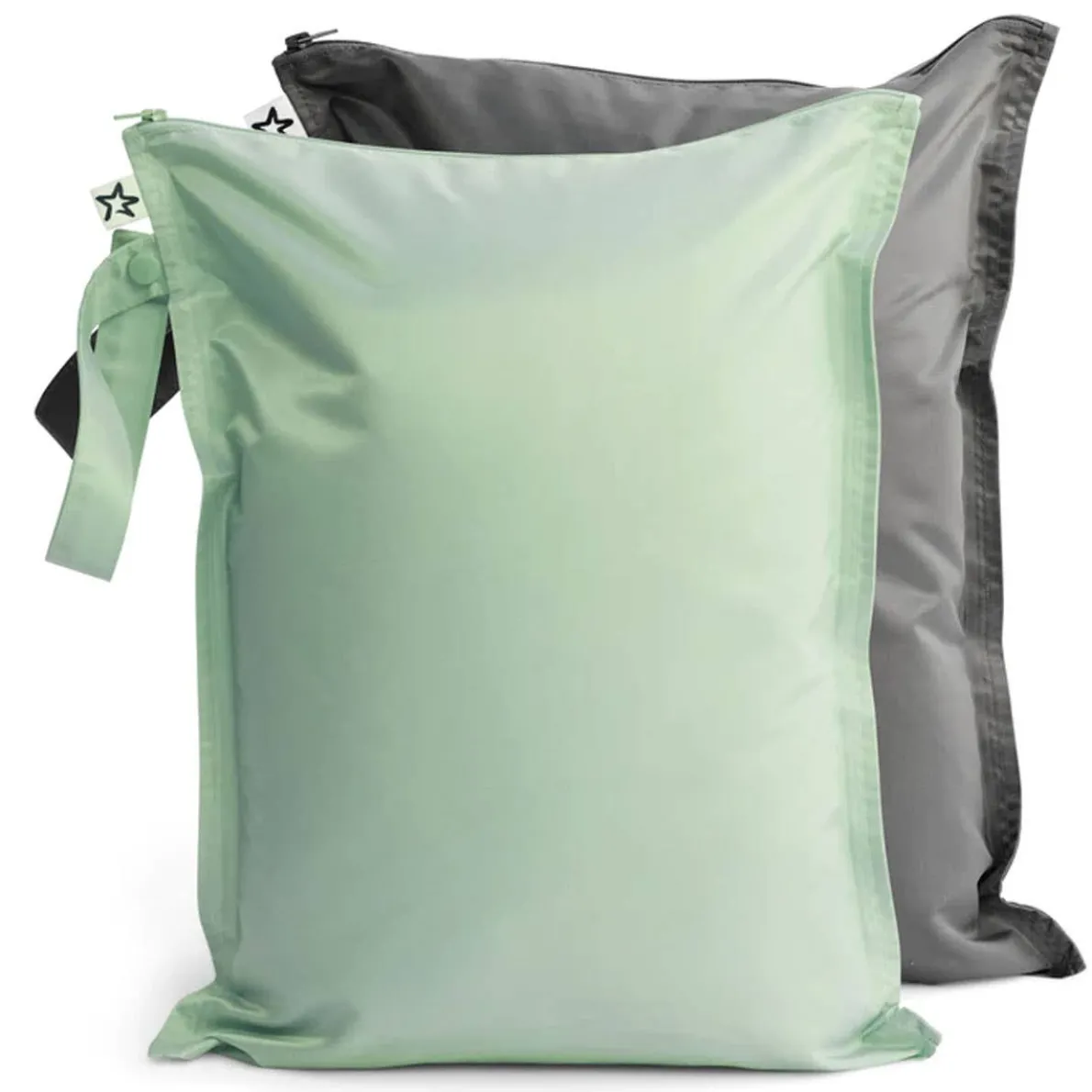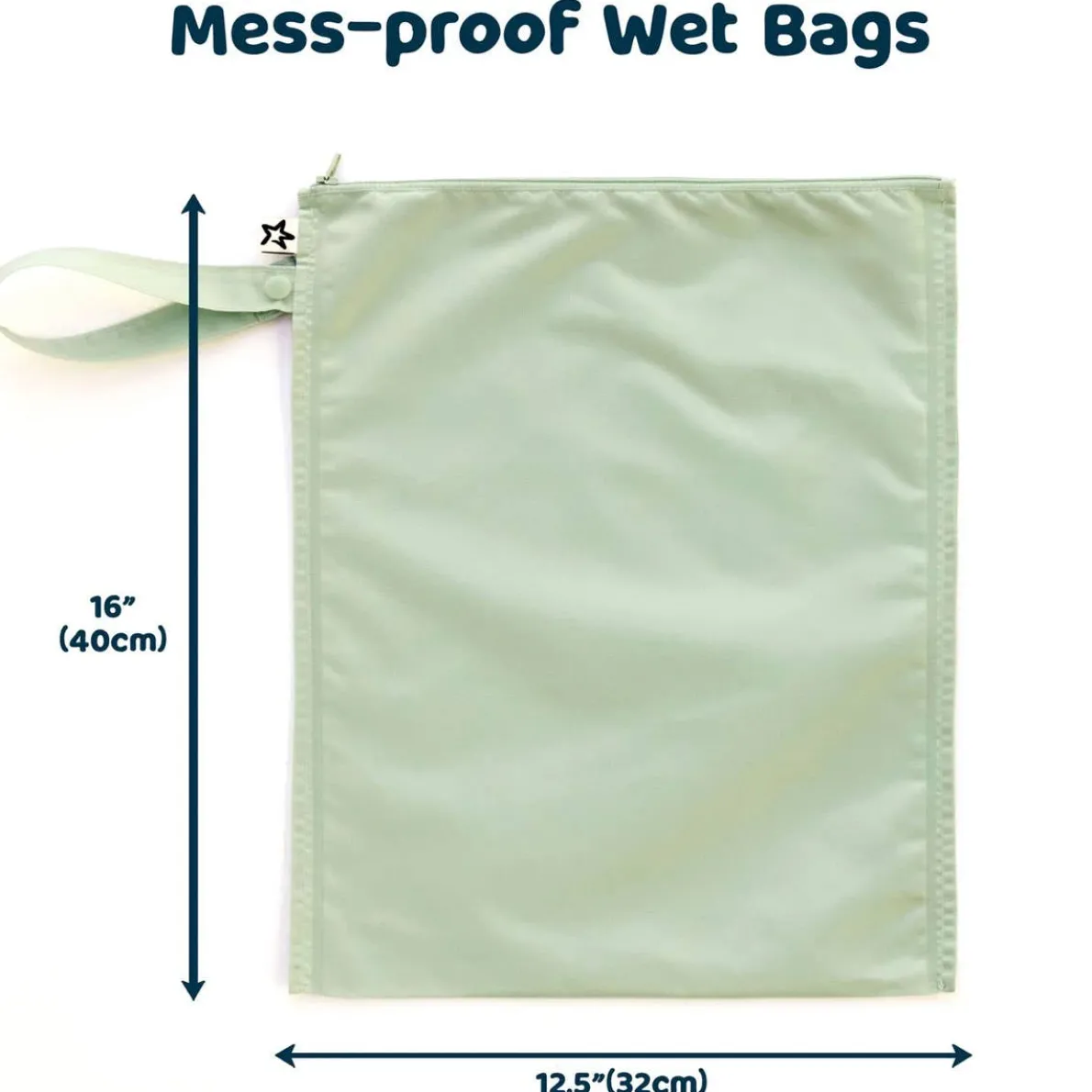 Tiny Twinkle Mess-proof Wet Bags are made from soft, lightweight, waterproof polyester that comes from 100% recycled plastic. These roomy bags are sized at 12.5×16 inches (32×40 cm) and are easy to carry or store in your larger diaper bag, hand bag or suitcase. The side strap handle easily attaches to strollers or allows for hanging storage anywhere. The heat-sealed seams make these Wet Bags perfect for storing messy or wet items when you are traveling!