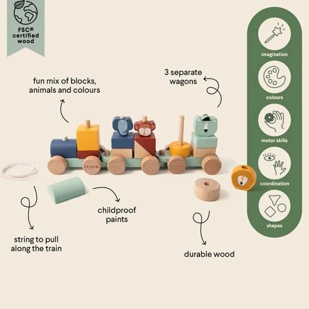Hop on the train with animal friends! With all the different blocks in various colours, you can create your own wagons. Use the string attached to the front to pull your train along on the greatest adventures! The train and all its elements are made of 100% FSC® certified wood. All paints on this product are water-based, safe for children and non-toxic.