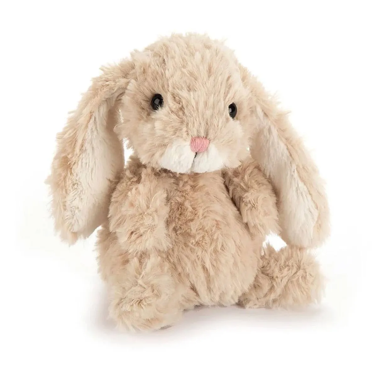 Perfect in gentle beige, it’s Yummy Bunny Beige! Tousled and tiny, this bobbly bunny has itty bitty poppet paws. With a cream woffle nose, long waggle ears and the diddiest bobtail you ever did see, this bunny hops right into your pocket!