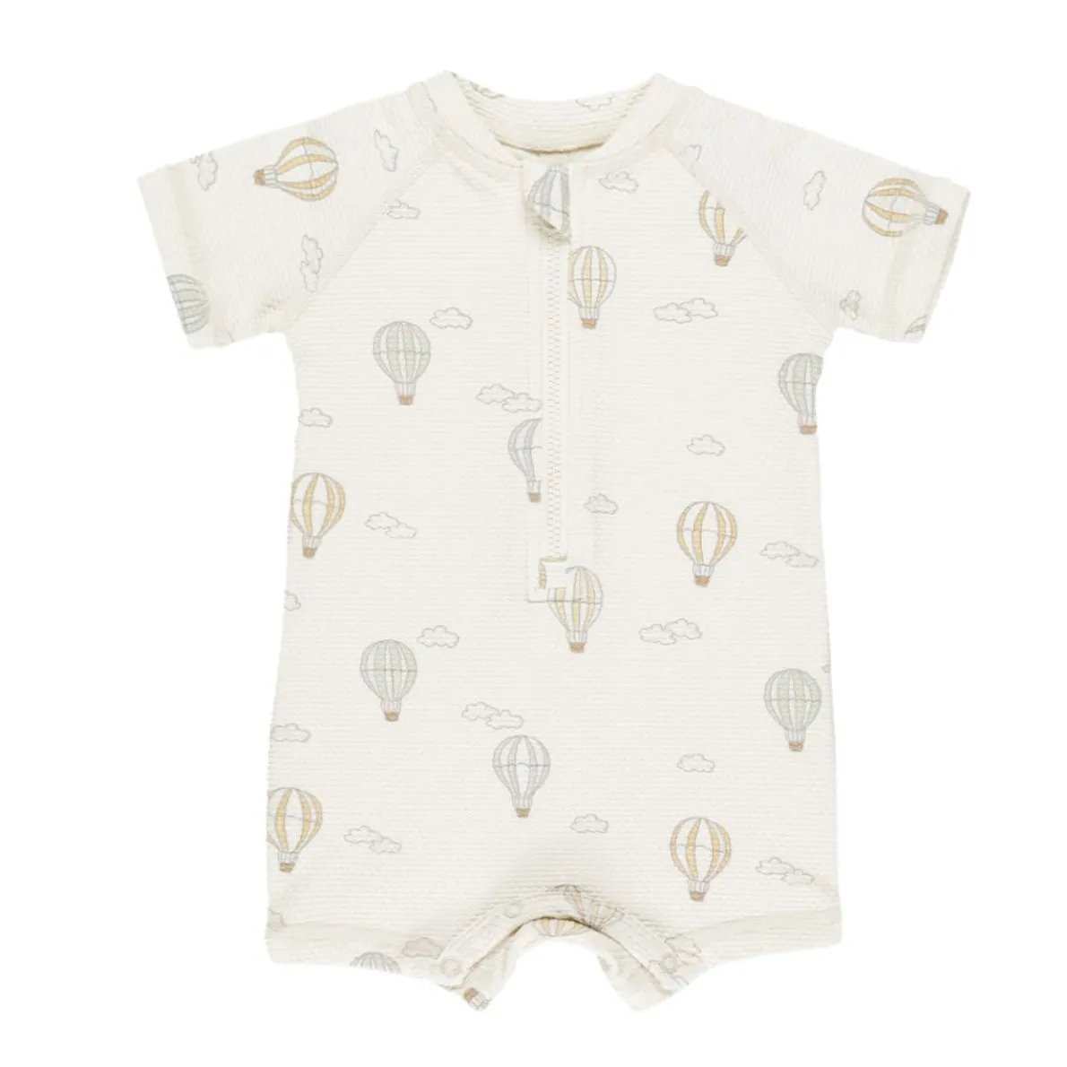 This pique short sleeve one-piece rashguard swimsuit will keep your little one protected from the sun in style. Featuring a zipper along the front for easy changes.