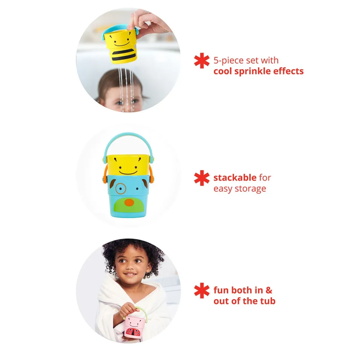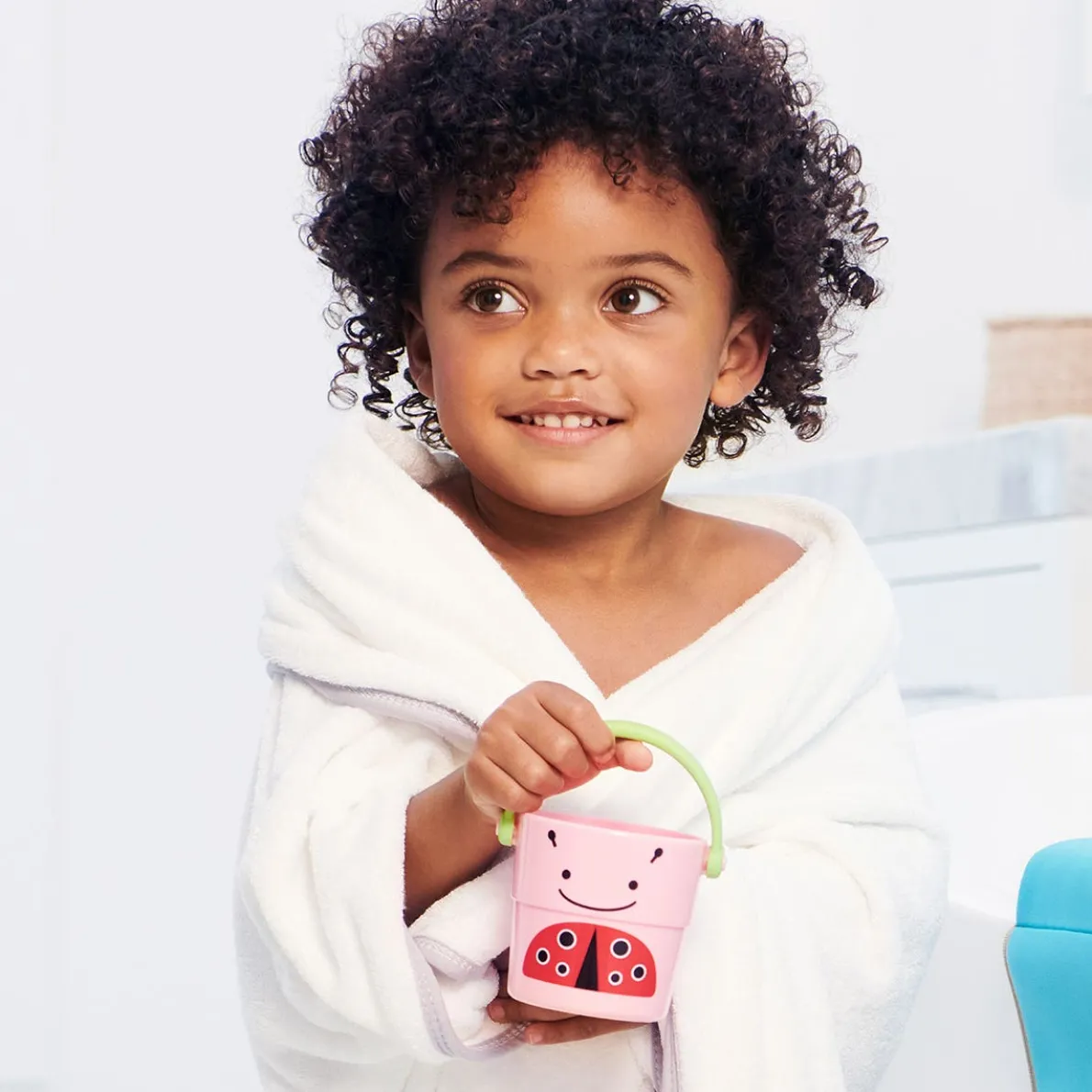 These friendly-faced nesting buckets feature three different sprinkle effects for bath time fun. Perfectly sized for little hands, these colorful buckets provide endless tubtime play while helping to build motor skills. Kids can drain water in a variety of ways with three different sprinkle effects. When bathtime’s done, just stack and store! Your child will love to soak up fun with Skip Hop’s full line of Zoo baby and toddler bath toys.