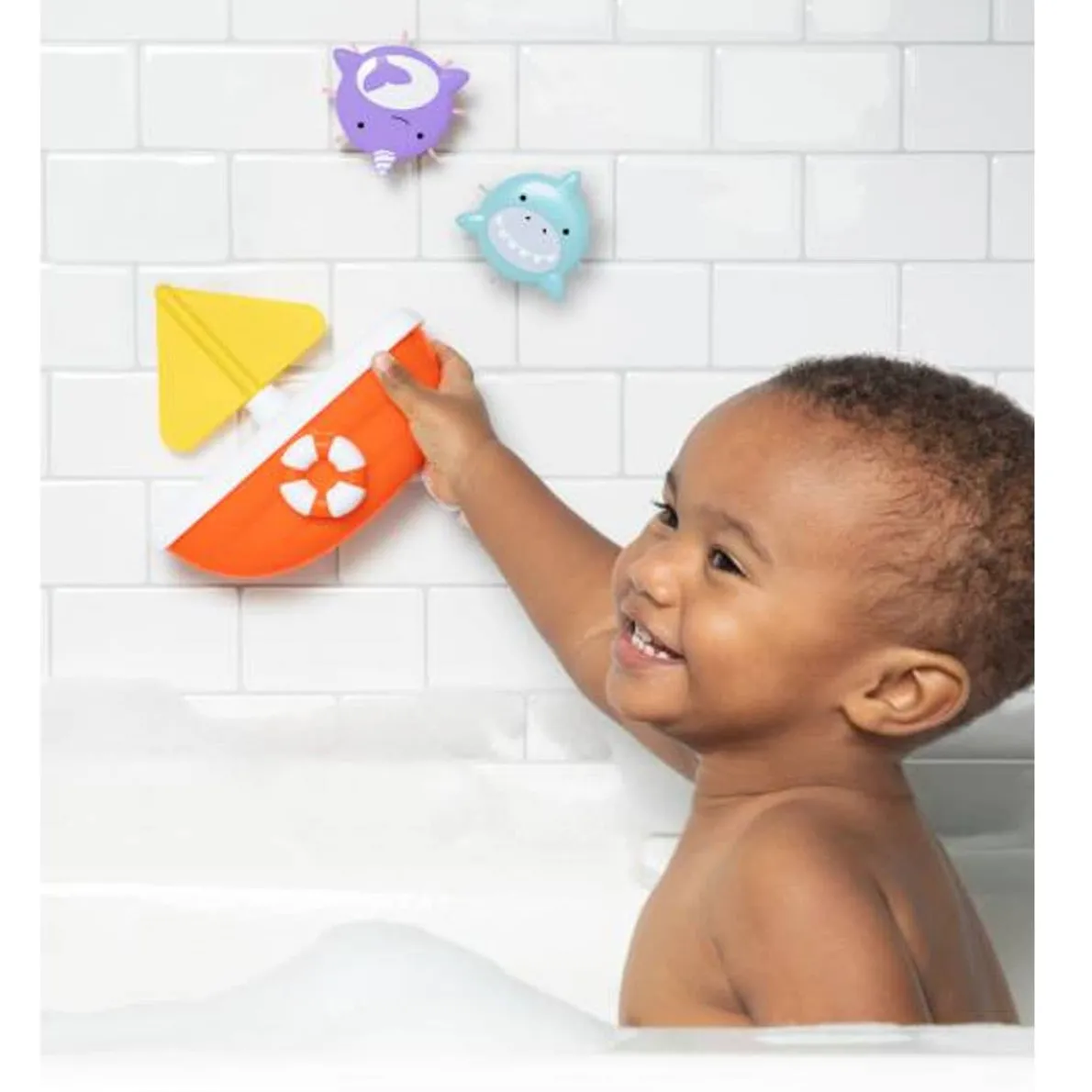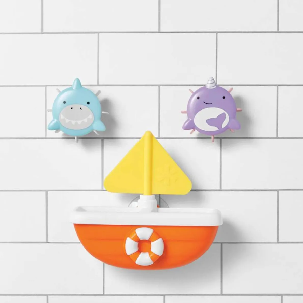 Sail into tub time fun with Skip Hop cute ZOO®️ bath toy. This tipsy-turvy boat plus shark and narwhal shipmates suction to the wall for an extra splash of fun. Pour water onto the boat to make it tip or pour over the characters and watch them spin.