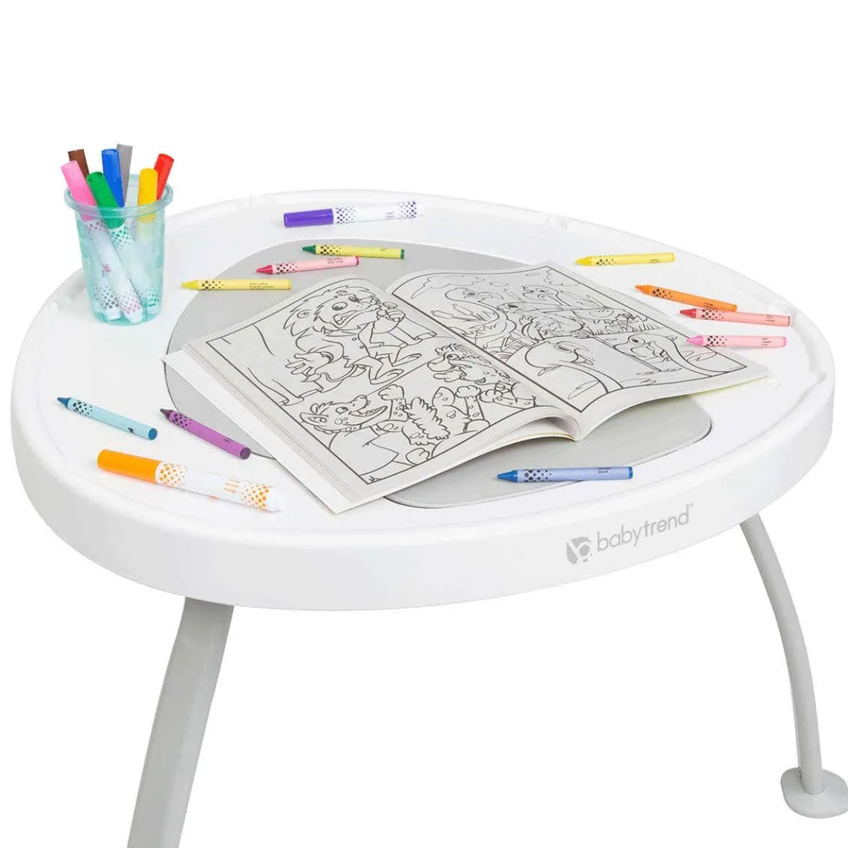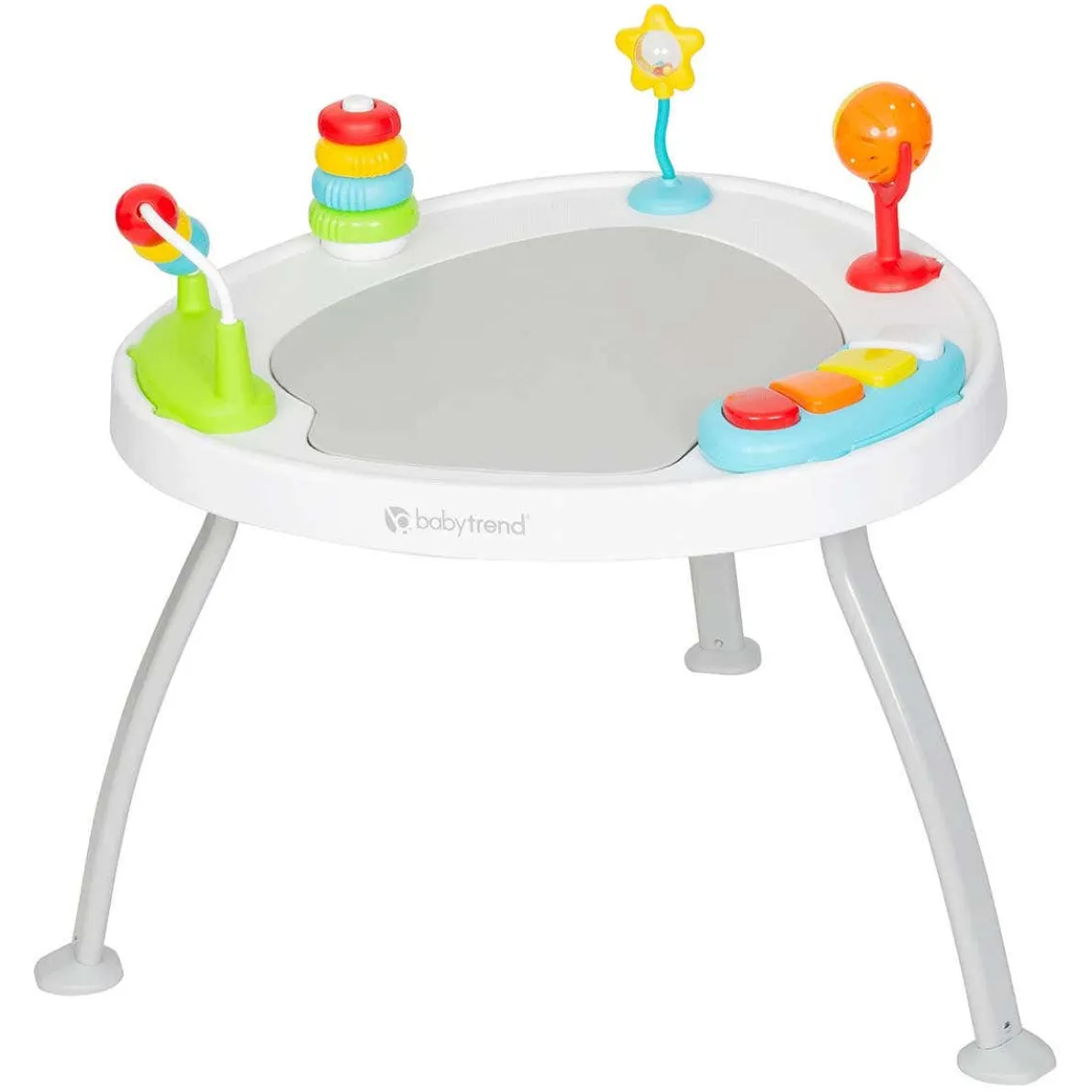 Created to grow with baby, the multi-functional Baby Trend 3-in-1 Bounce N’ Play Activity Center easily converts from an activity center, to an Activity Play Table, then to a Flat Table allowing your baby to discover and develop. With the sturdy 3-point leg support, parents can have peace of mind watching your kids play while learning. Baby’s curiosity is captured with the 360 degree rotating seat, bouncing board and removable toys. The bouncing board that has three position height adjustment will support your baby’s height and body motion as well as help them learn tip toeing. We designed 5 unique toys attached to the table so your little one can learn while playing. It will also improve their eye-hand coordination and brain development. The toys are removable and can be used as standalone toys. As your baby grows, our Baby Trend Bounce N’ Play Activity Center can convert into a clean, sturdy flat table for playing, reading, coloring and more. The activity center is designed for babies aged 6 month and up. .