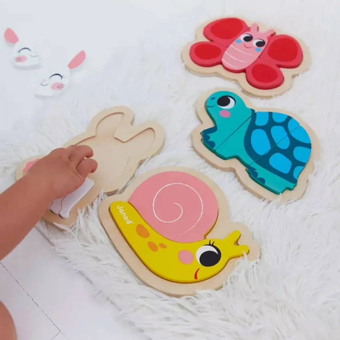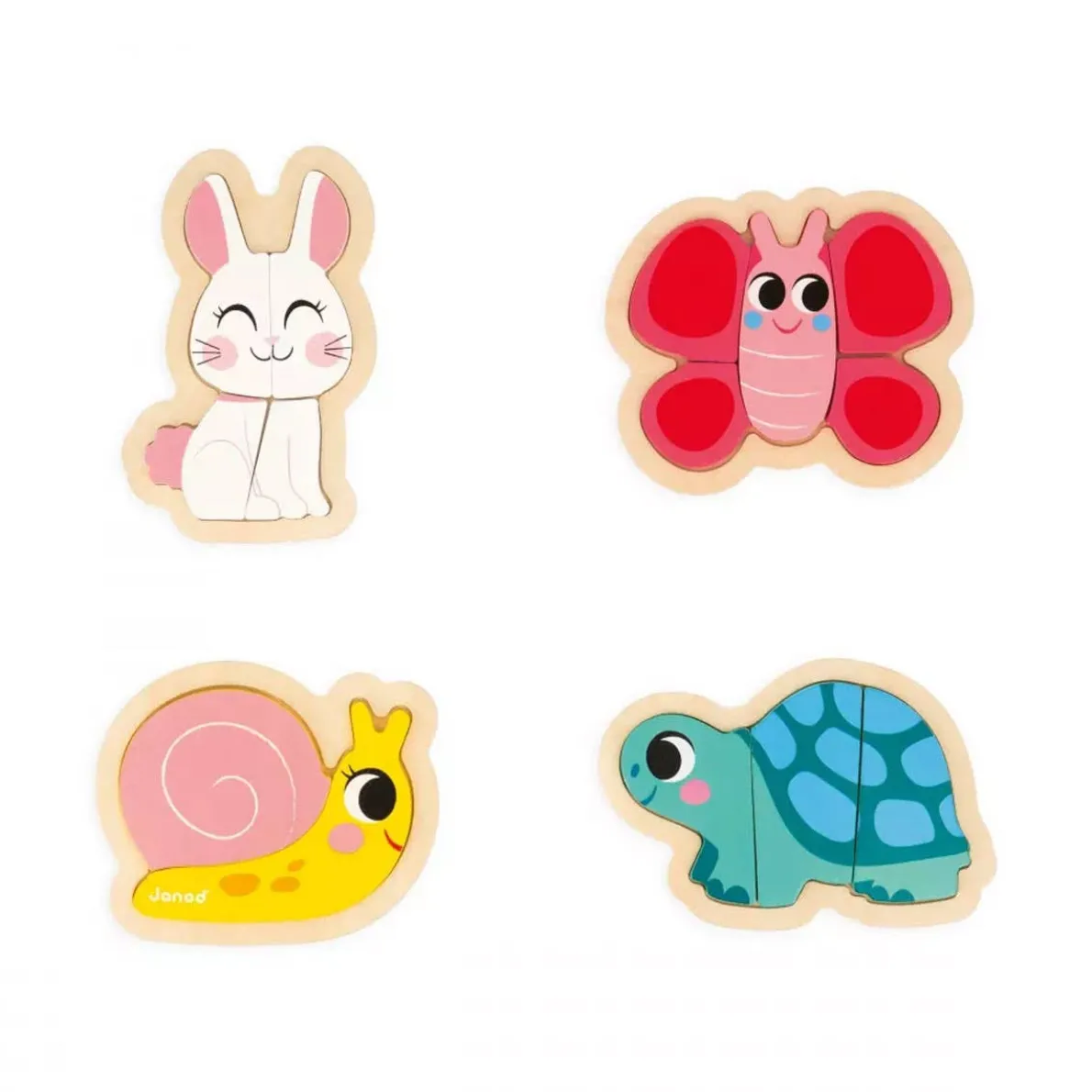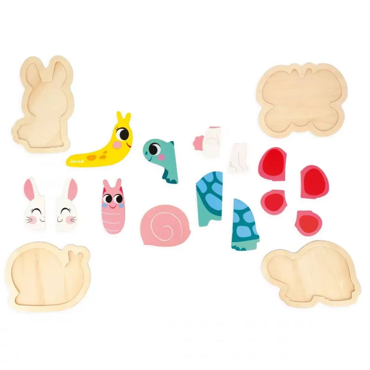 - The garden puzzle includes a 2-piece snail, a 3-piece tortoise, a 4-piece rabbit and a 5-piece butterfly.