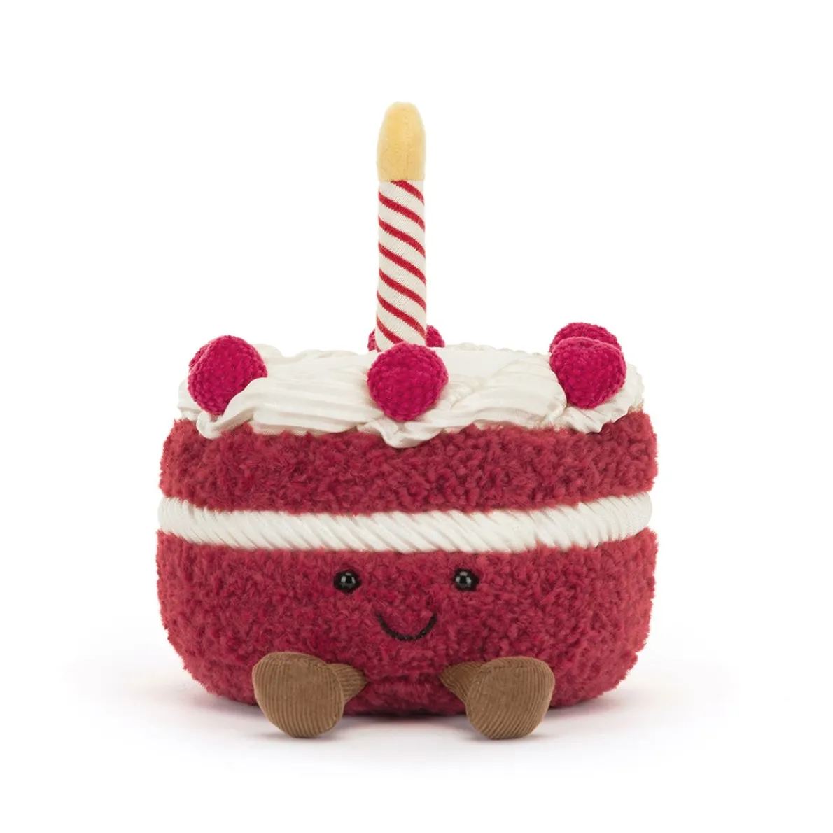 Amuseables Cheri Cake has been baked with love. This red velvet sweetie has a base of bold red tousled fur, with cream textured icing. Finished with textured berries and topped with a striped, lit candle, this smiling sponge is the perfect sweet treat.