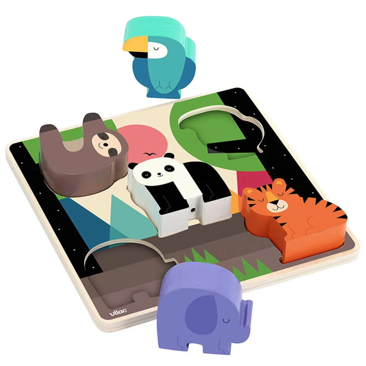 Jungle sound puzzle by VILAC. Includes 5 pieces beautifully illustrated by Andy Westface