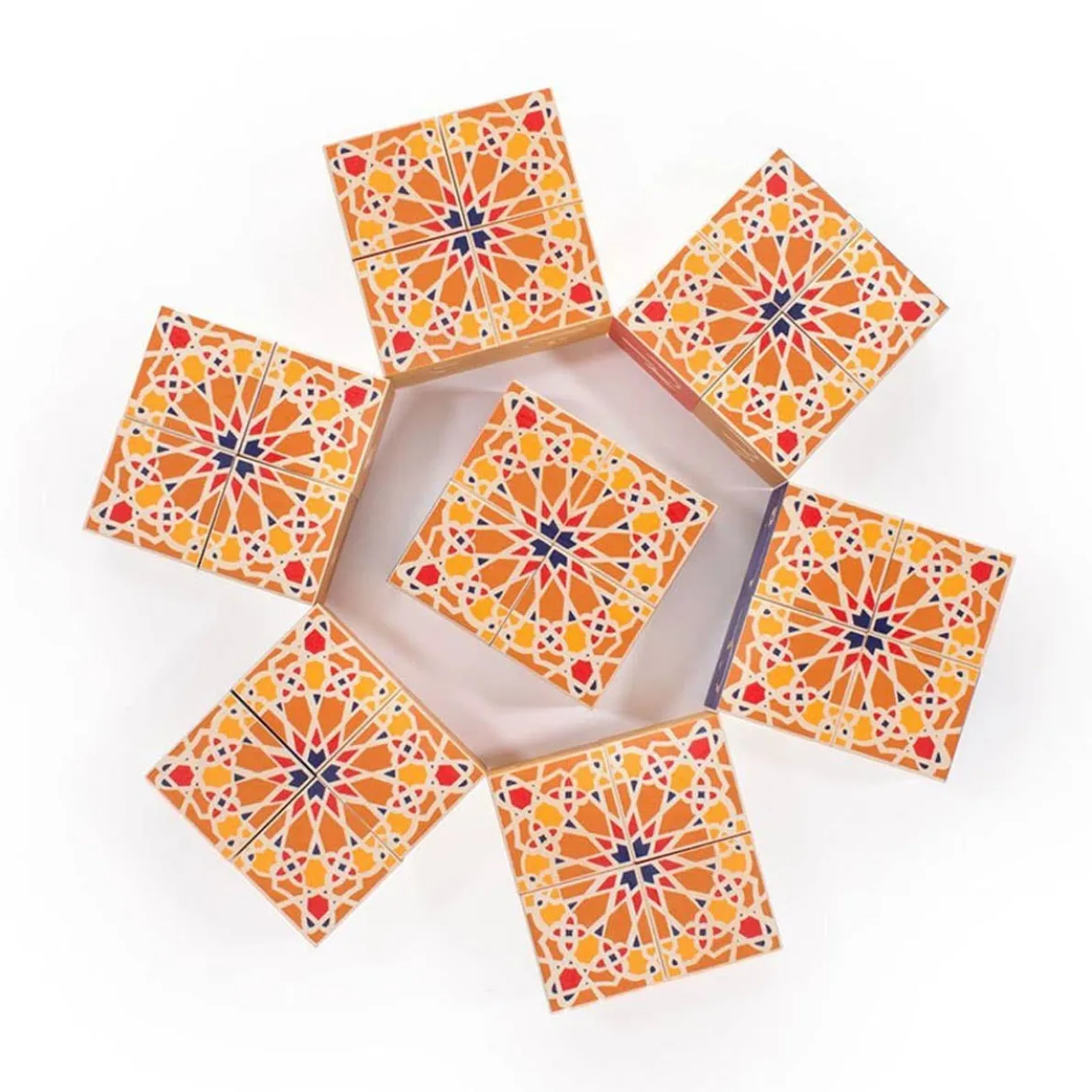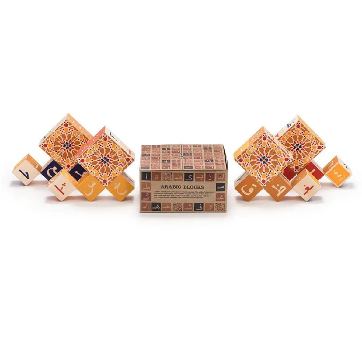 Arabic. One of the world’s oldest written languages. The original expression of geometry and algebra. This colorful 28 block set features each letter of the Arabic alphabet, with two debossed letters per block. You will also find math symbols, numerals and a decorative mosaic pattern