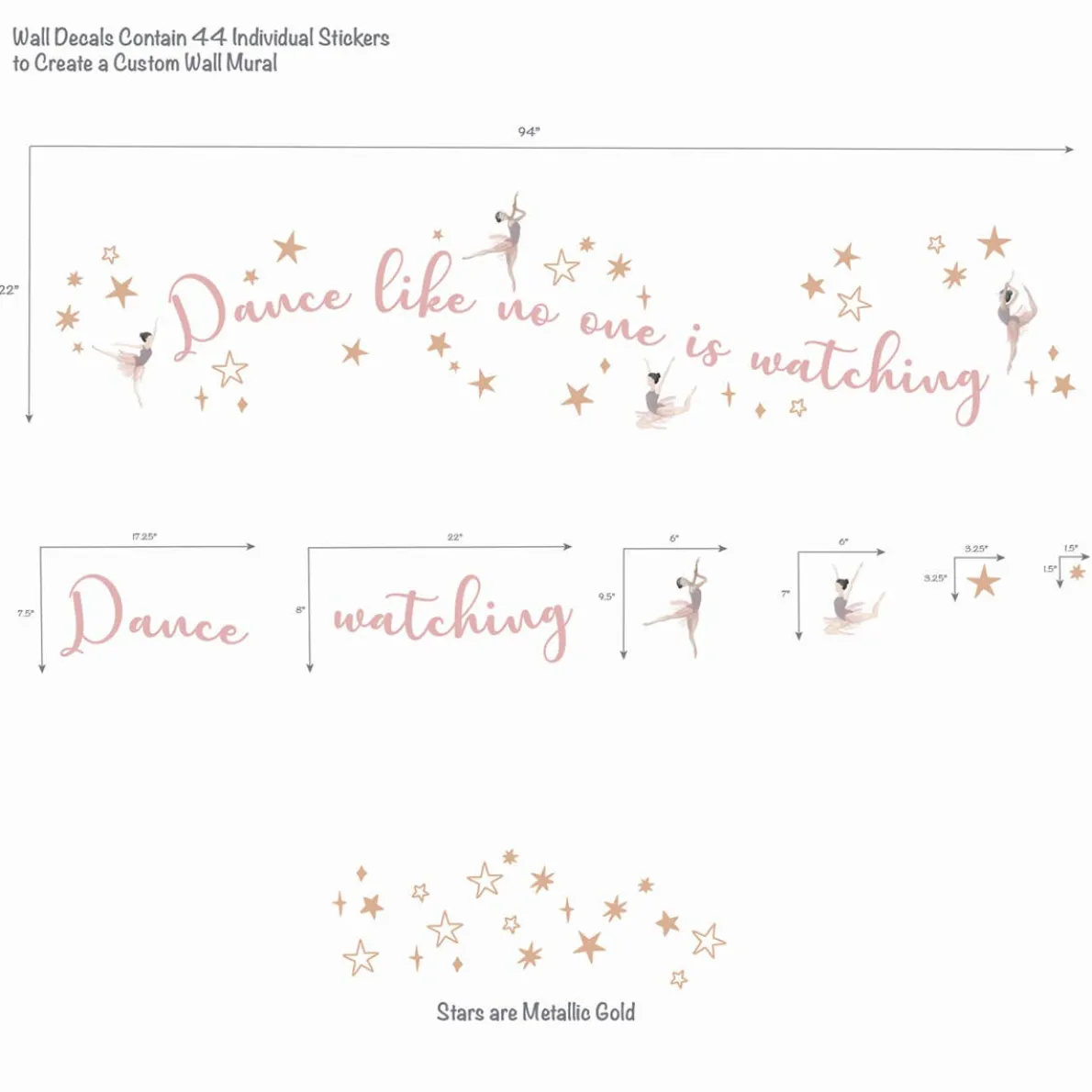 These Ballerina baby wall decals featured with pink wording and saying” Dance like no one is watching “, 4 girls stickers with ballet dance steps and stars are metallic gold colour. These easy on, easy off wall appliques are the perfect way to complete your designer nursery. These wall decals create the look of a mural without any of the hassle of paint. They are easy to apply and easily removable and will not harm your walls. Please note: set includes one set of wall decals which contains 44 individual stickers.