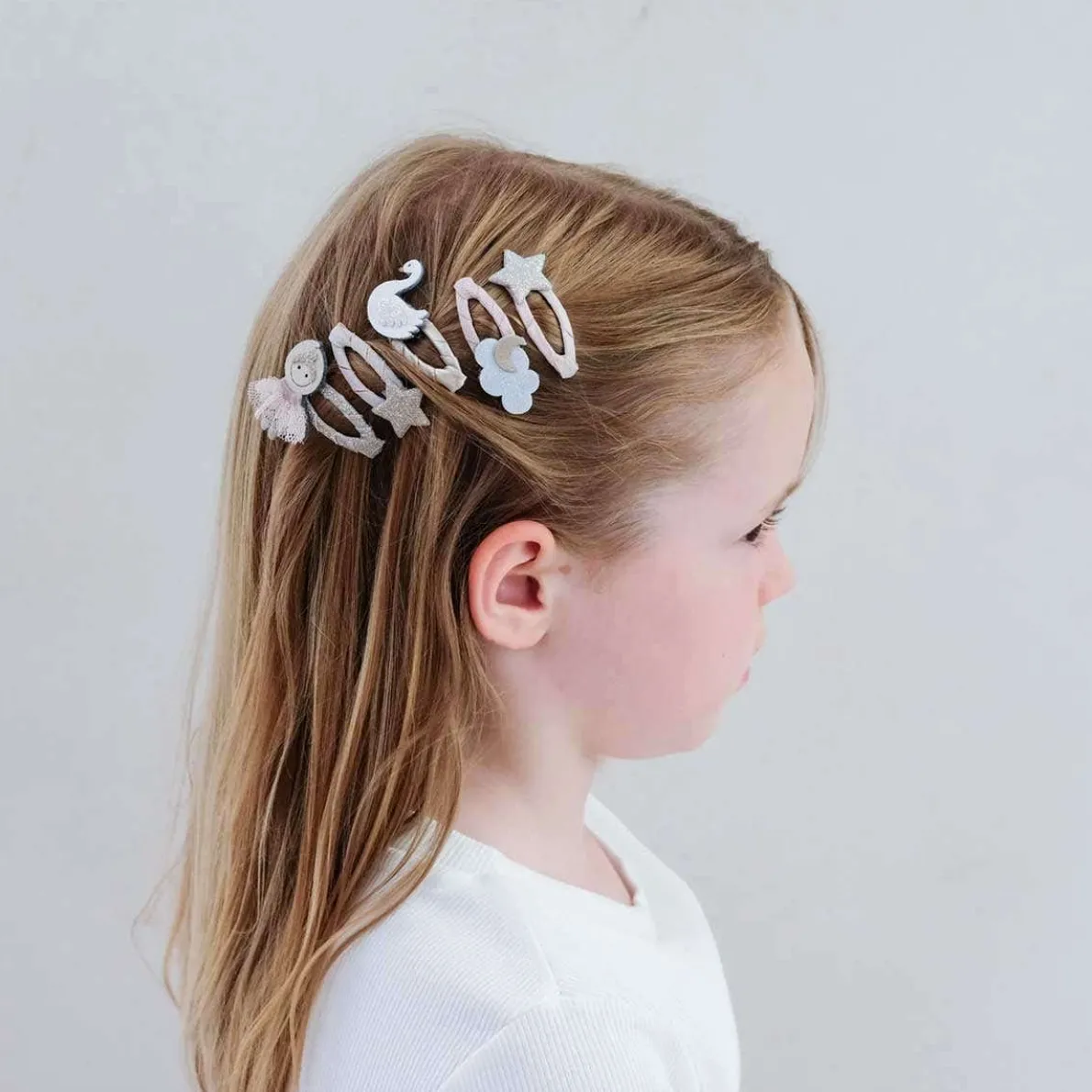 These ballerina mini clic clacs bring a sprinkle of glittery magic with charming swan, star, and cloud designs. Perfect for adding a playful sparkle to any hairstyle. Ideal for little dreamers who love a touch of shimmer and fun!