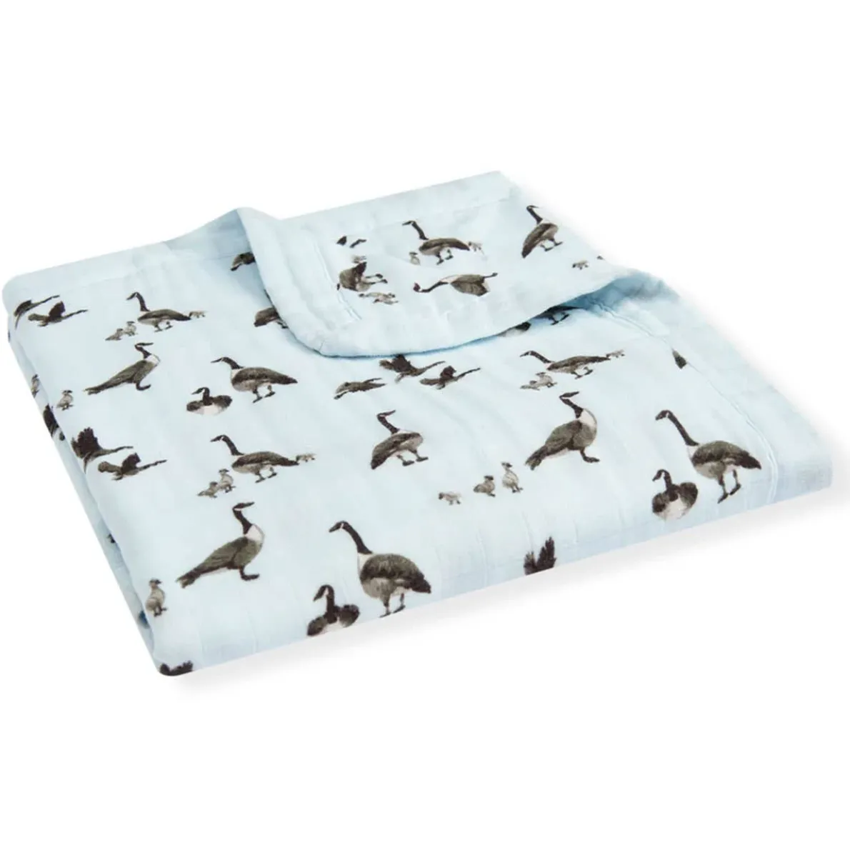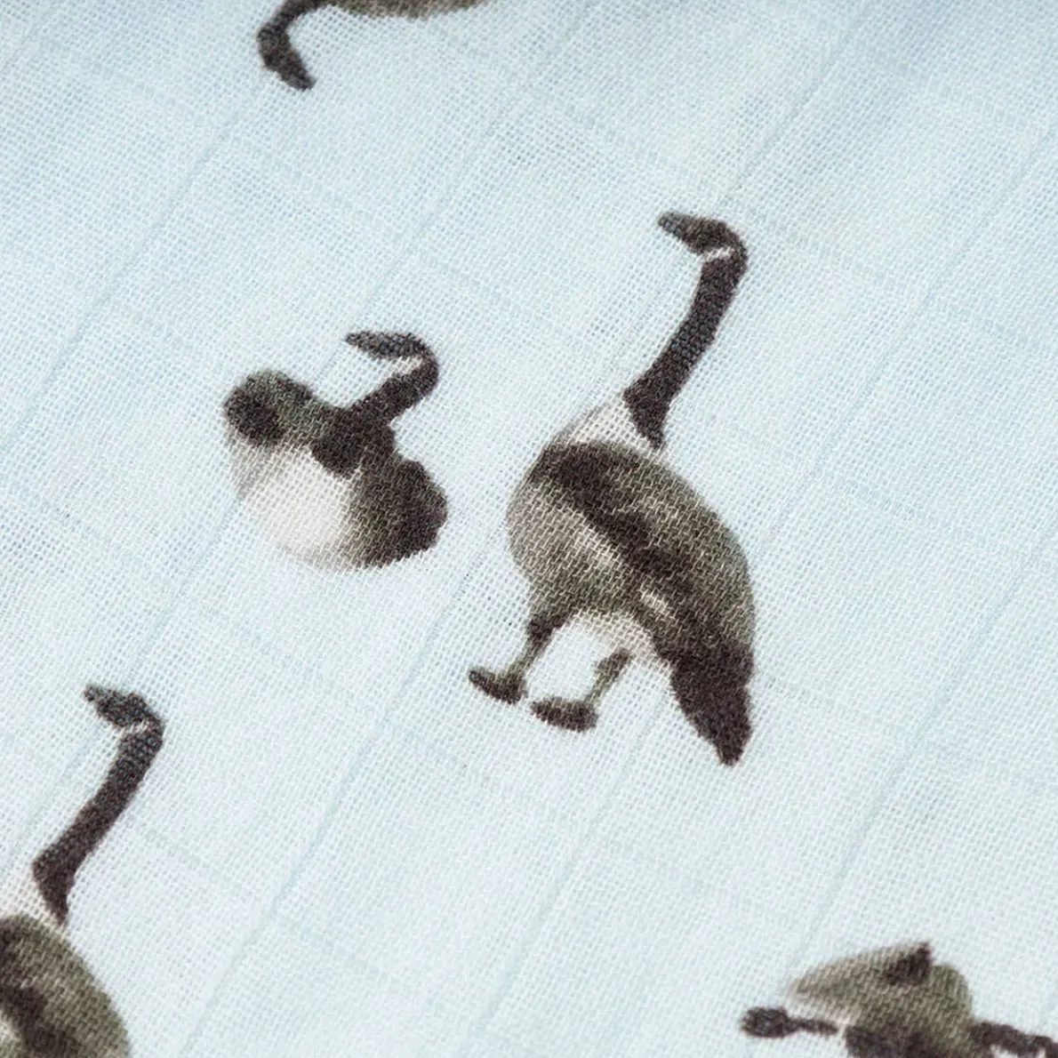 The ultimate in comfort, generously sized Big Lovey Muslin Blanket in the Goose print allows for extra snuggles and cuddles.