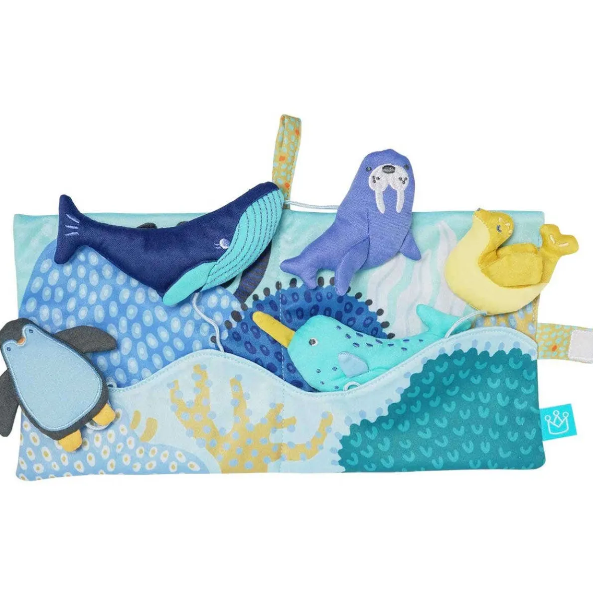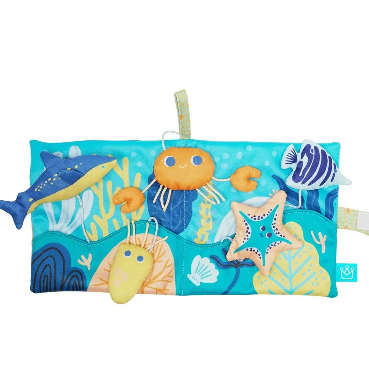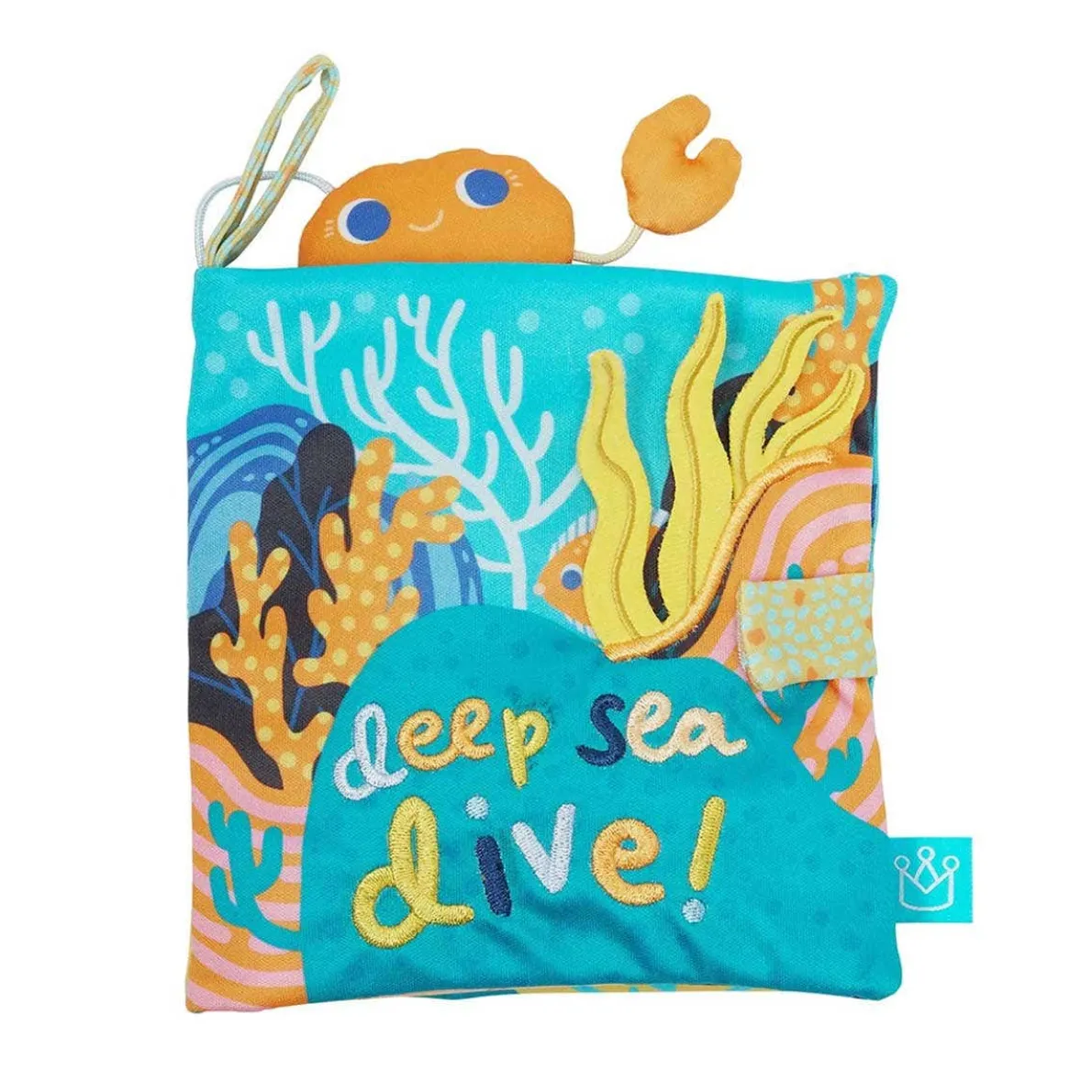 The water-friendly soft book folds open, revealing under-the-sea graphics and five tethered-on reef creatures. A pocket allows for stashing creatures away for peek-a-boo fun. When playtime’s over, squeeze out excess water and hang to dry. The bath book is the perfect addition to tubby-time play. Machine washer and dryer safe.