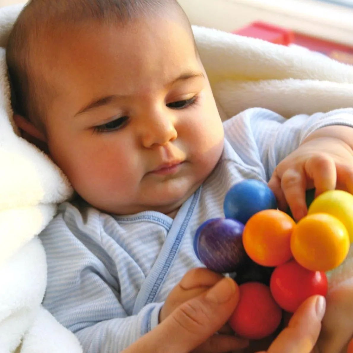 Your child will enjoy feeling the smooth texture and exploring the contours of each colourful ball. Babies love rolling the balls around, and shaking them too. Rolling the balls over each other is a soothing, calming experience — an ideal tactile de-stresser. It will be enjoyed by both children and adults alike.