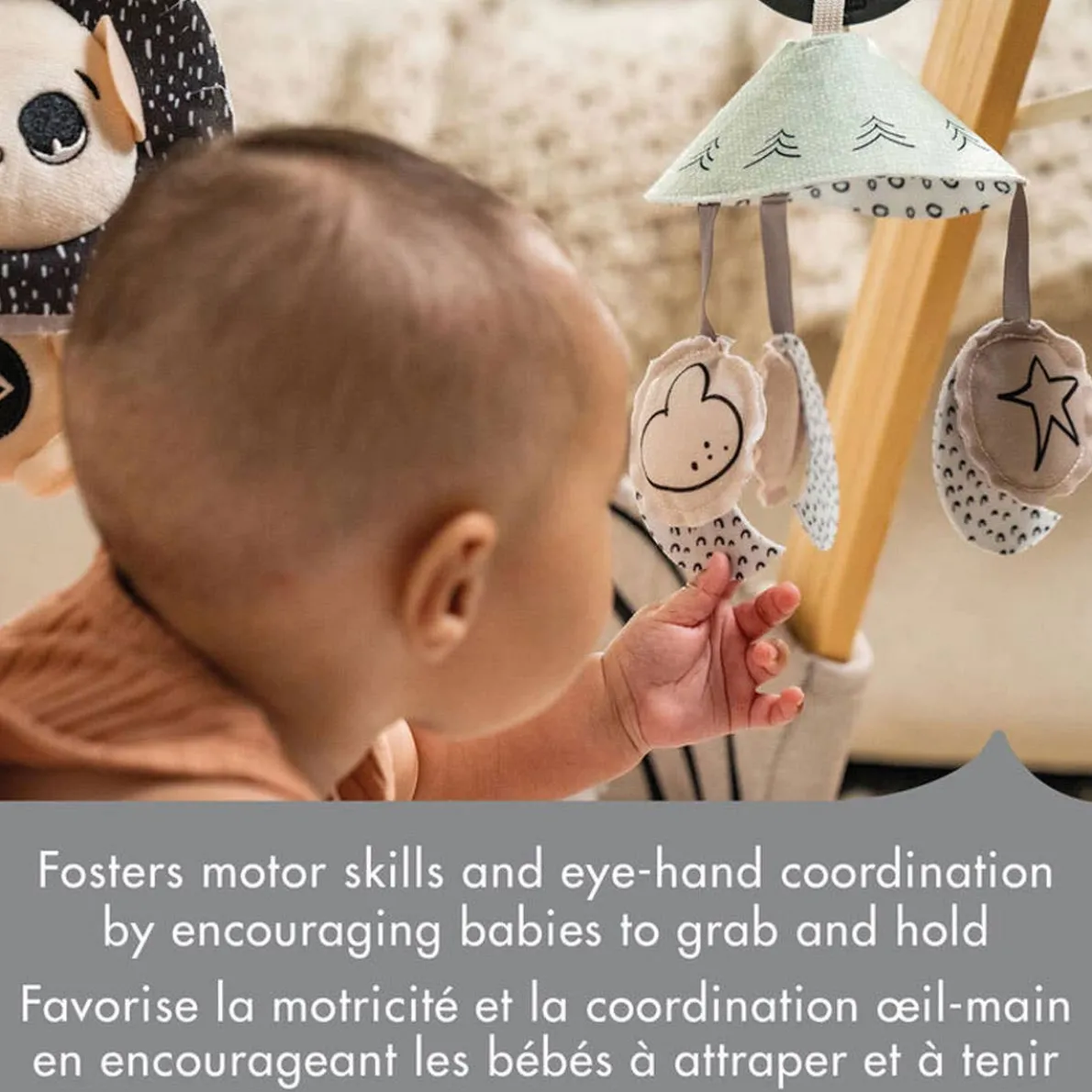 - Crinkly peek-a-boo tree with satin ribbons teaches babies about object performance.