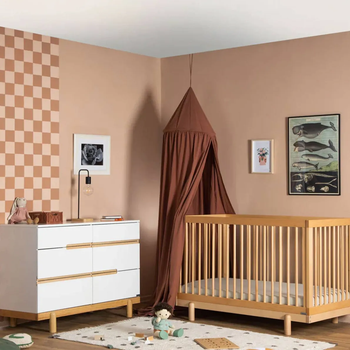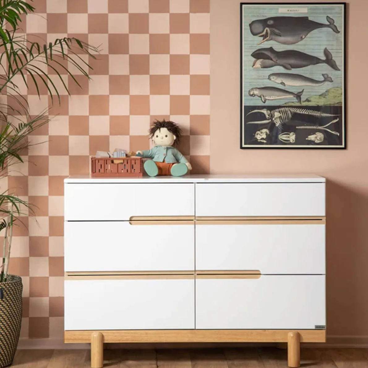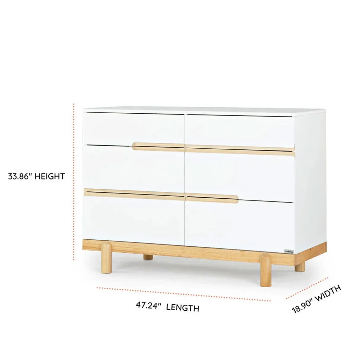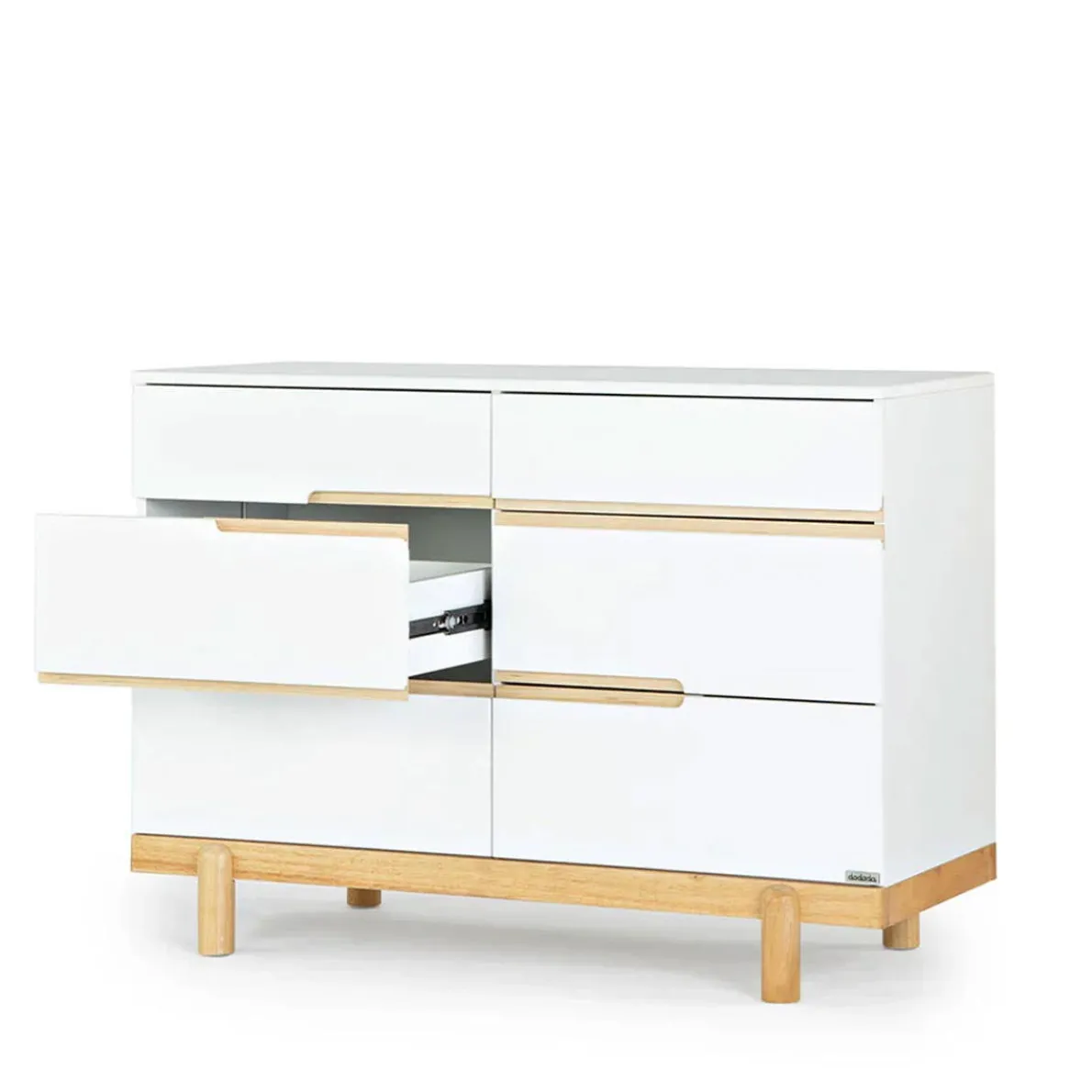 A beautiful place for everything: that’s the blissful magic of the 48” Bliss 6-drawer Dresser. Secure on its sturdy base of solid rubberwood legs, the Bliss dresser’s innovative drawer face design lends cheerful energy to its essential purpose – to provide ample storage for all of baby’s belongings in deep, smooth-gliding drawers. Pair with a changing table addition to save space in the nursery, or add this playful dresser to any room in your home that needs an infusion of organization and joy.