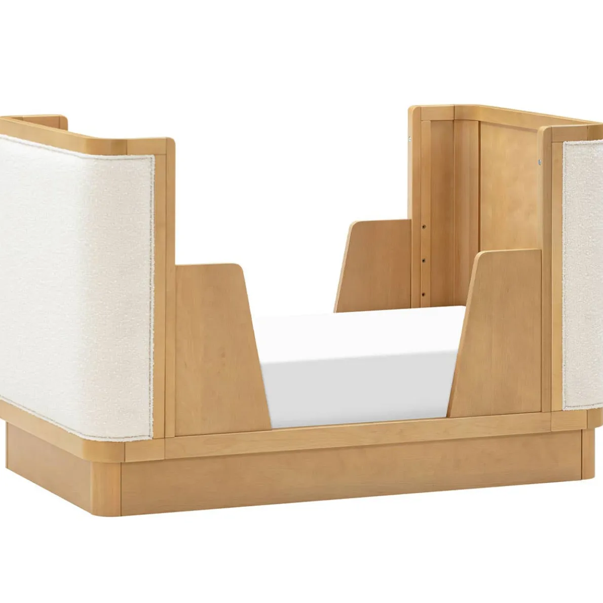 The Bondi Boucle 4-in-1 Convertible Crib celebrates boho-inspired design with its warm wood tone, rounded corners, and cozy boucle upholstery to create a dreamy aesthetic for your nursery . The Bondi is designed to grow with your babe using an included toddler bed conversion rail and is screened for harmful chemical emissions to ensure it meets GREENGUARD GOLD Certification.