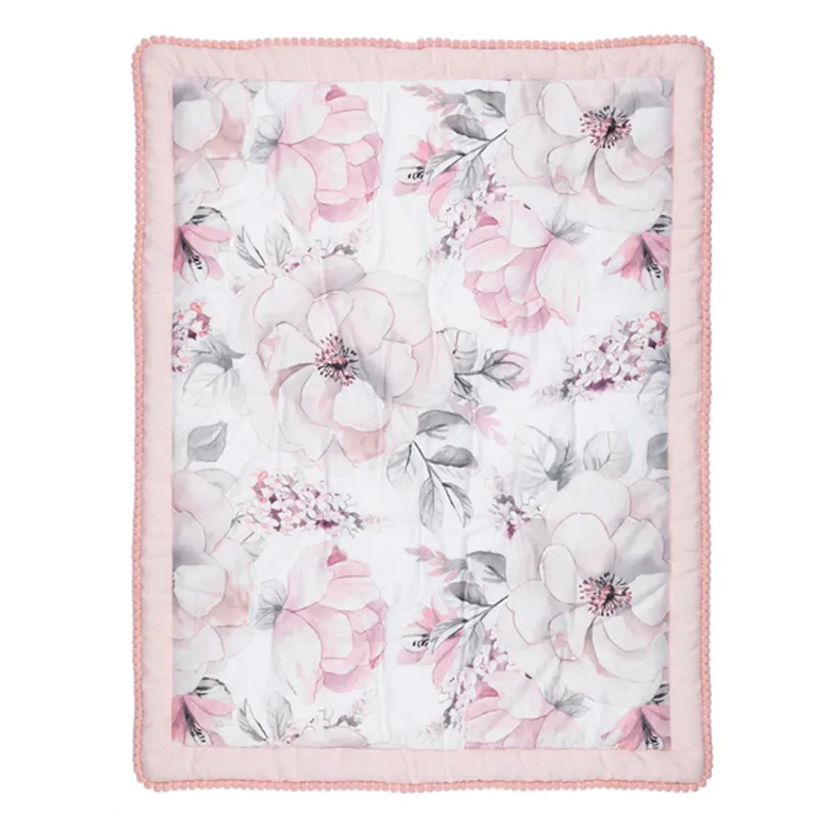 This beautiful reversible floral themed baby bedding nursery set comes complete with a quilt, 100% cotton fitted crib sheet, pom pom trimmed crib skirt and a complete set of wall decals. These gorgeous blossoming flowers are in shades of soft pink with gray accents. It looks like an exquisite watercolor painting and has a border of a linen rayon blend. Pretty pink pom poms decorate the entire quilt and the reverse side is a gray ground with all the pretty coordinating flowers. The 100% cotton fitted crib sheet matches back to the front of this lovely quilt. A 16” long crib skirt in a lovely shade of pink linen and rayon includes the pom pom trim and finishes off the crib in complete luxury. Add to that a set of beautifully toned large wall decals which add a designer touch to the nursery.