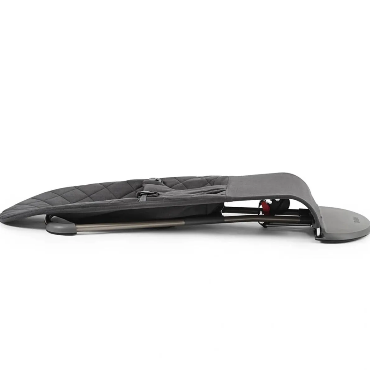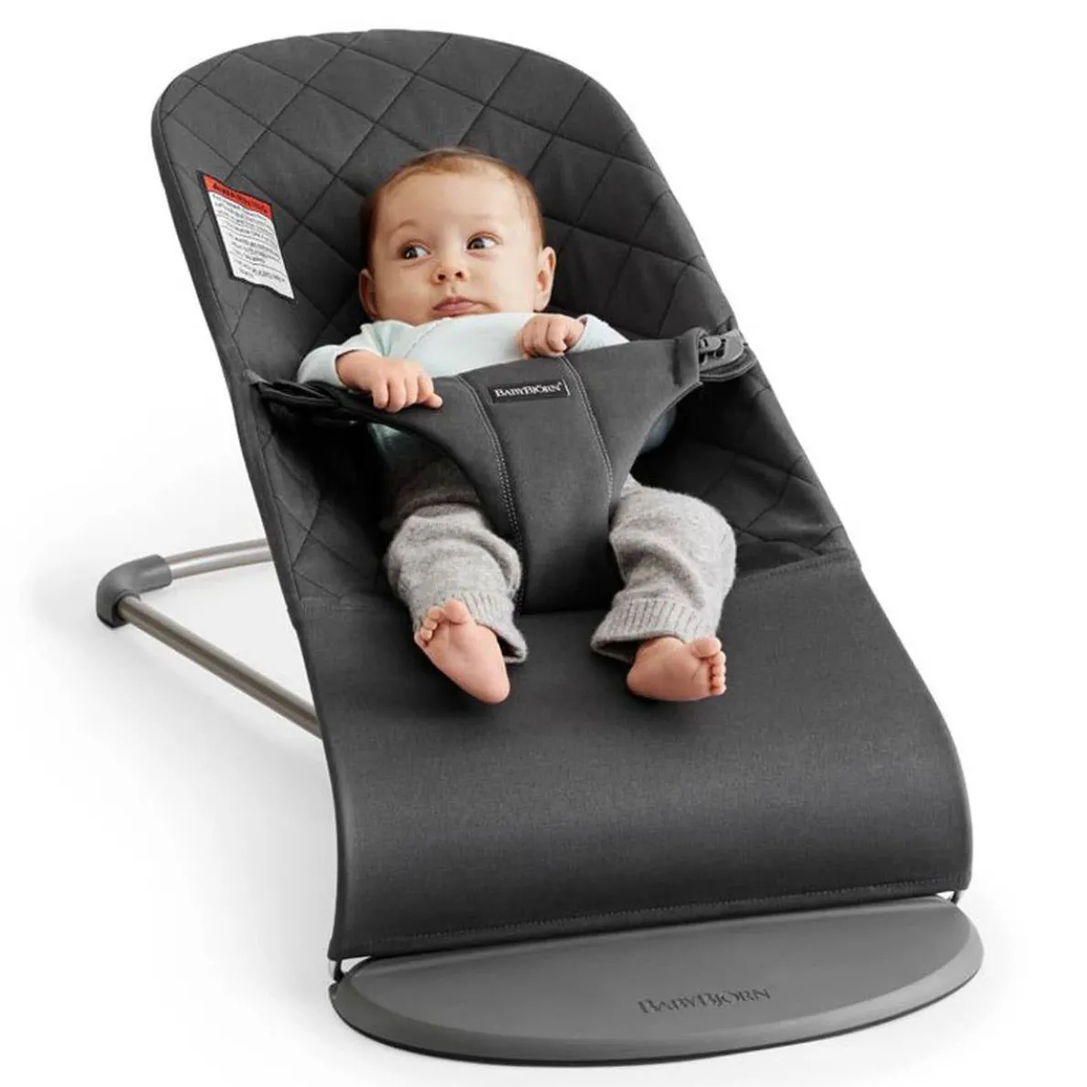 - Bouncer Bliss is a lightweight and handy baby bouncer with a dark gray frame and a fabric seat in cotton has a soft and snuggly feel.