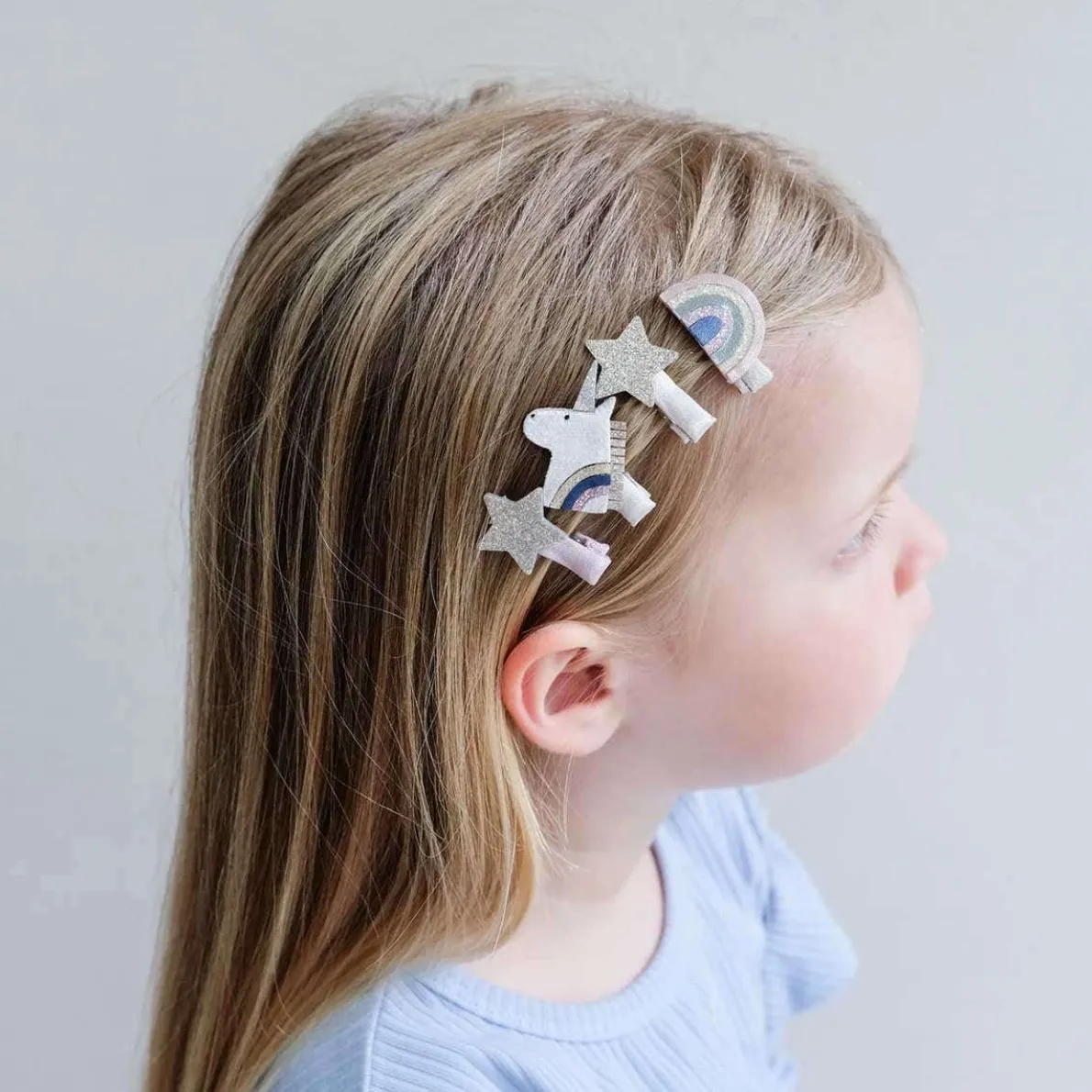 Add some mythical magic to their hair with Celeste unicorn mini hair clips! Super soft unicorns, rainbows and stars come together in the prettiest palette of pinks and pastels for a look they’ll love!
