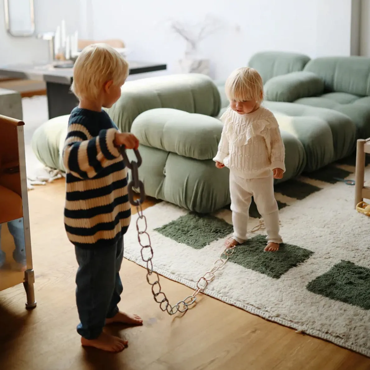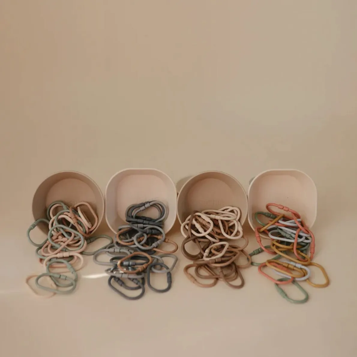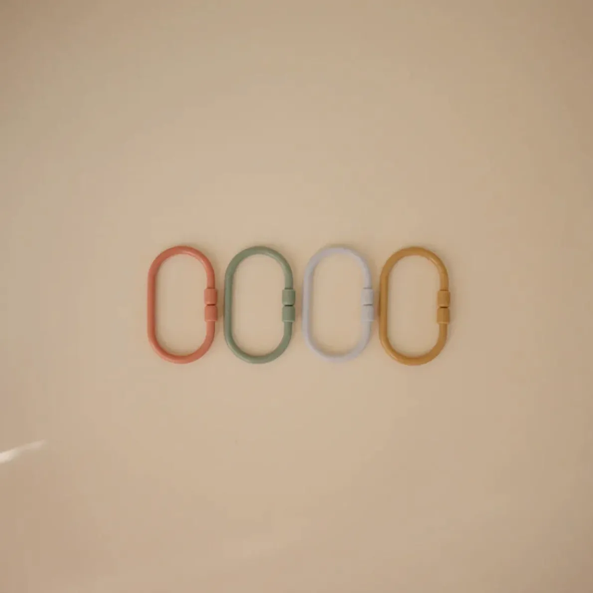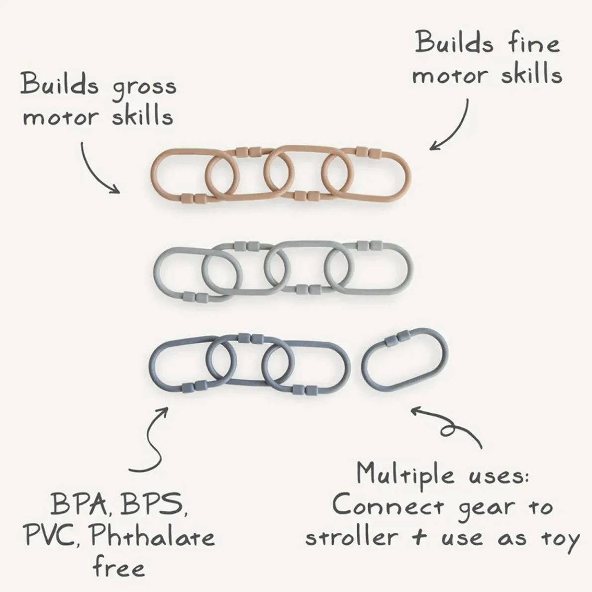 Keep toys within reach while engaging littles in a playful learning experience with mushie chain link rings. These durable, yet flexible plastic links can quickly attach toys to strollers and car seats, ensuring that favorite companions are always close by. Each set features three soft colors to help engage little ones and improve sorting skills. The minimal design and smooth, lightweight non-toxic material makes it easy for small hands to grasp and manipulate, enhancing fine motor skills.