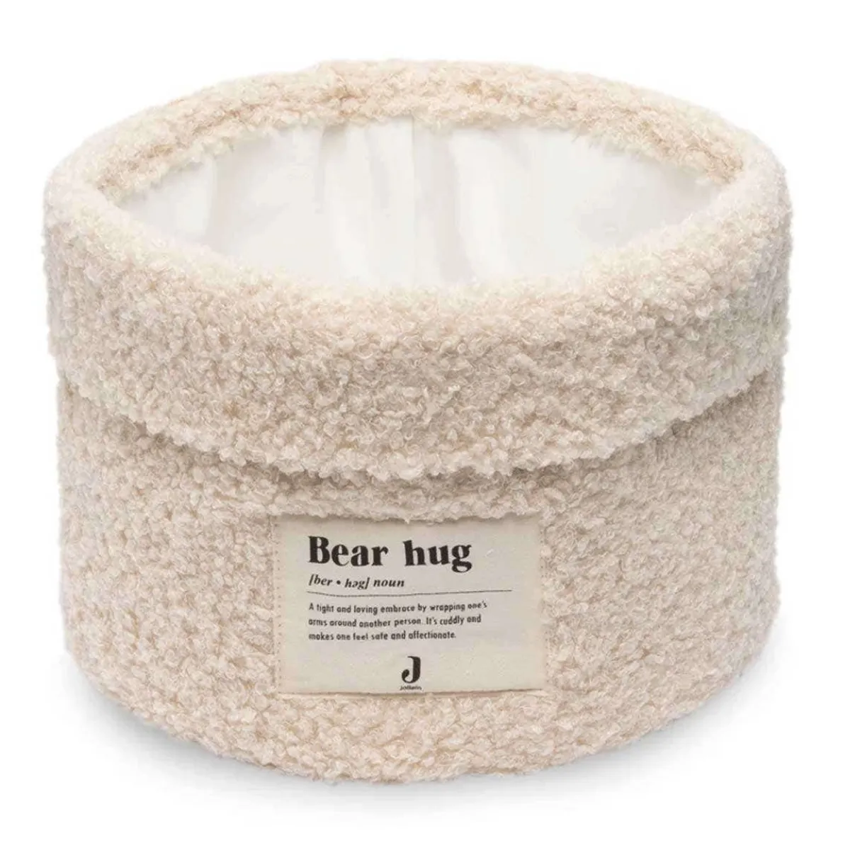 Practical basket made of soft pettable Bouclé fabric, perfect for storing loose items. The front of the basket shows the fun ‘bear-hug’ logo. This basket is super practical to put on the changing table, to store little care items like a manicure set, a brush and a thermometer. And at the same time, it’s a perfect item to add some atmosphere to the baby room. With this storage basket, you can keep the drawers of the dressing table tidy. A basket for socks, for care products and for baby slippers. It also looks very stylish on the dressing table! It’s also very practical in the living room, for small toys. You can also combine this dressing table basket with the large storage basket Bouclé.