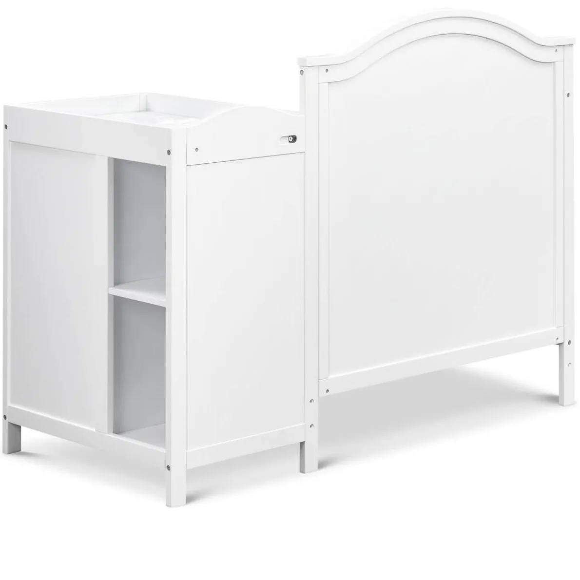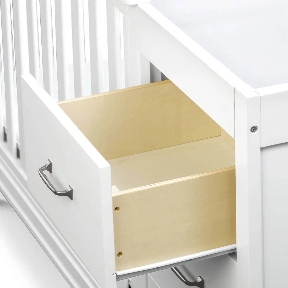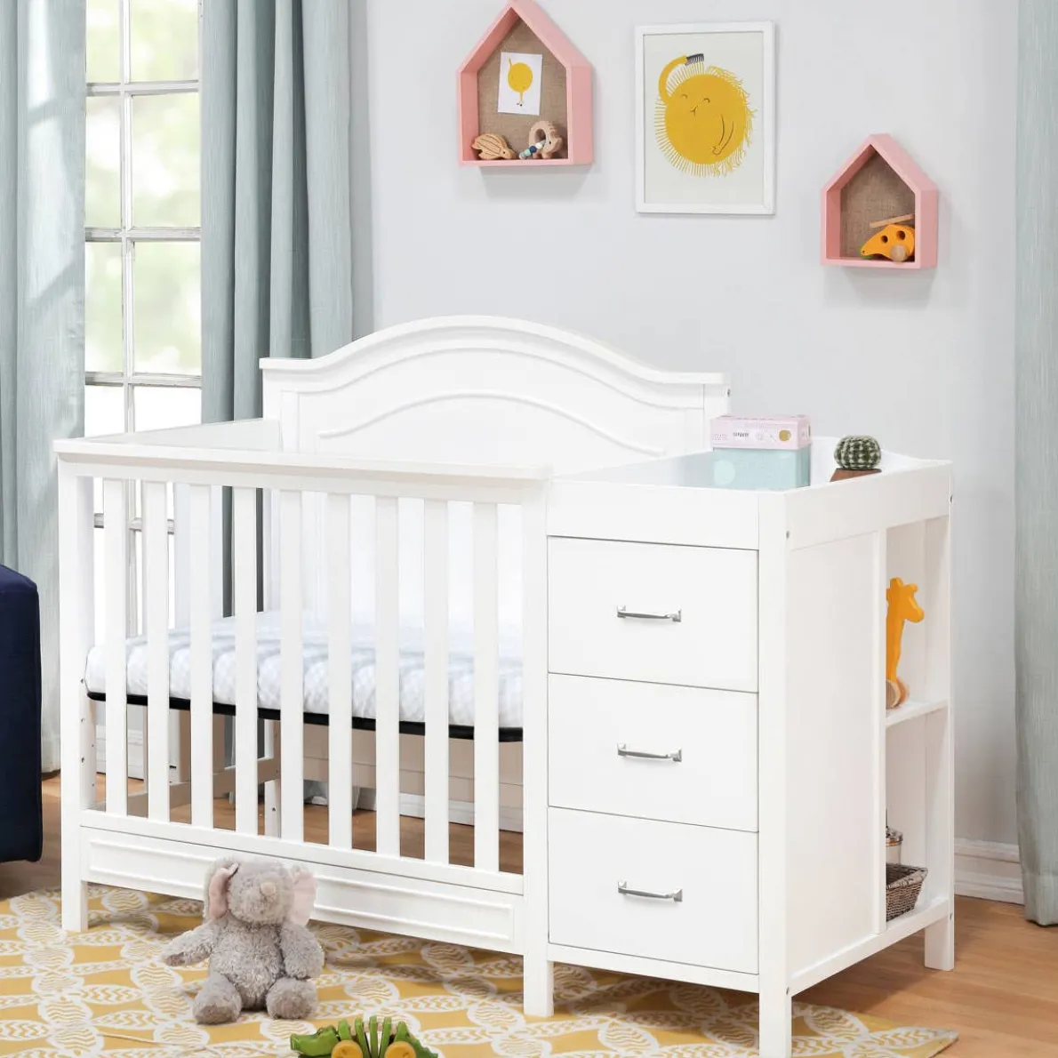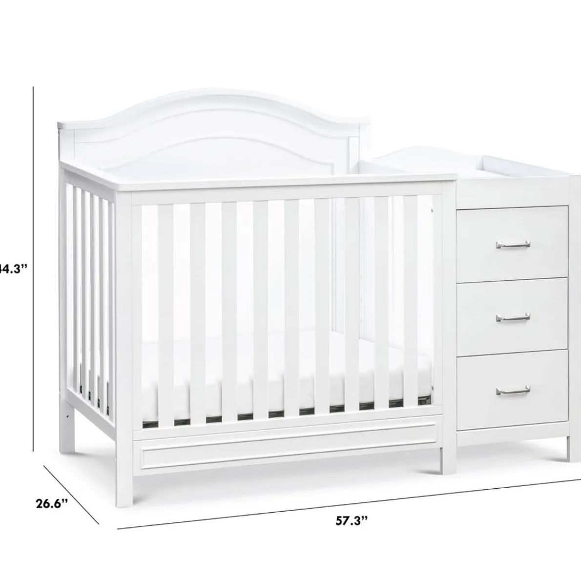 The Charlie 4-in-1 Convertible Mini Crib & Changer is a beautiful, comprehensive solution for any stylish nursery. Its compact size helps maximize smaller spaces, so that your baby has more room to play and grow! Beyond the nursery years, this crib converts to a mini toddler bed, day bed, and twin-size bed with detached nightstand.