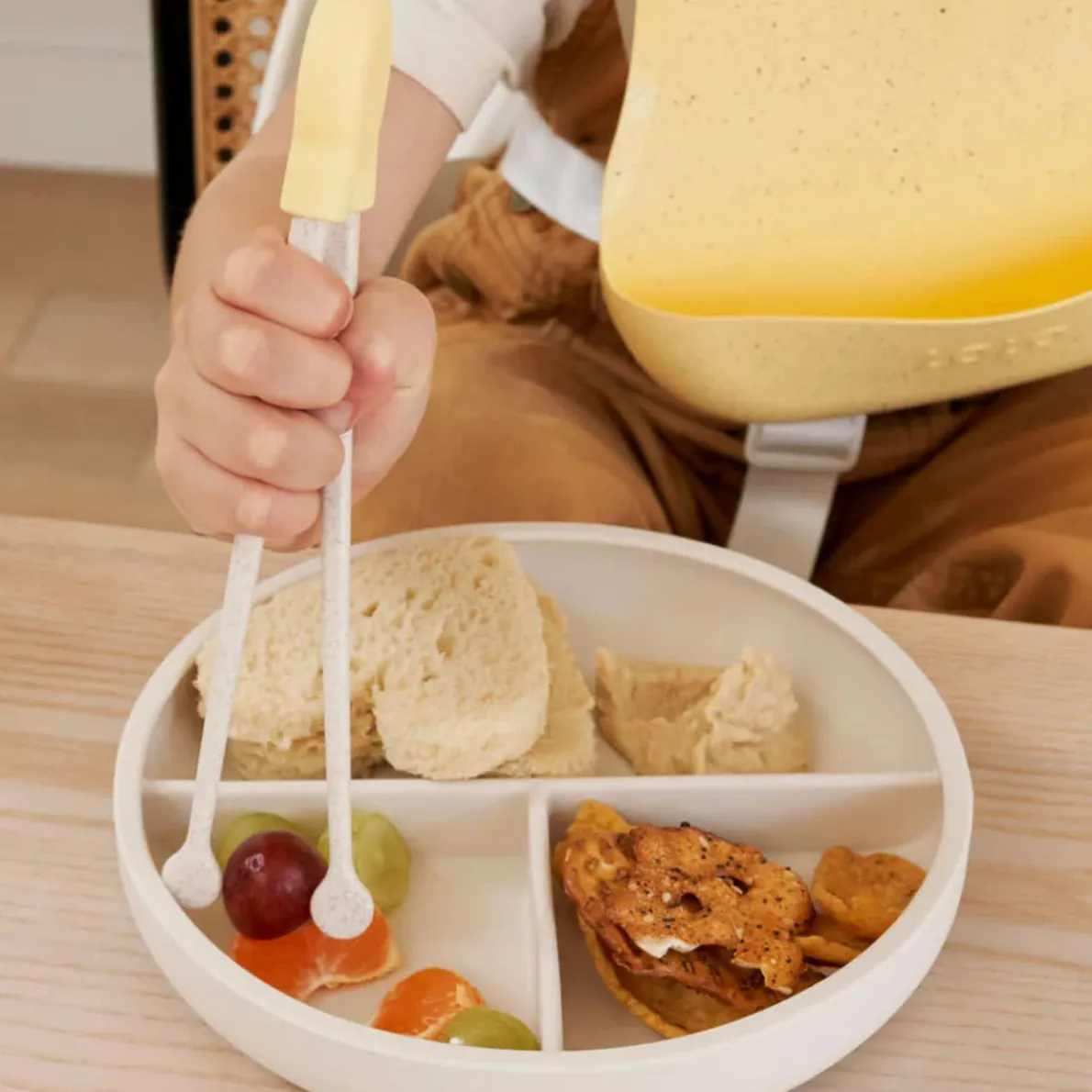 Hello, fine motor skills. Set of two sticks and holders were made for chopstick mastery, featuring food-gripping strength. Made with non-toxic, BPA-free, food-grade silicone that is dishwasher safe.