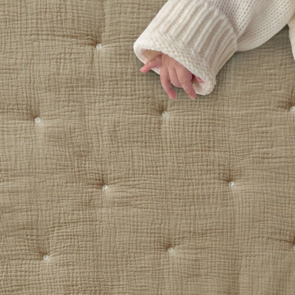 The Cloud Muslin nursery set is 100% cotton (not including decoration) and features 5 beautifully coordinated and complementary pieces, consisting of a quilt, one fitted sheet, two swaddles and a snuggable bear lovey.