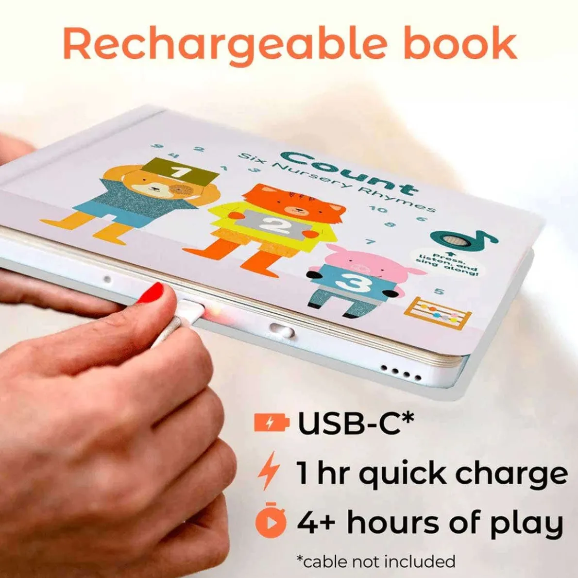 All books are rechargeable with a standard USB-C cable (not included).Books charge in 1 hour and provide up to 4 hours of playtime.