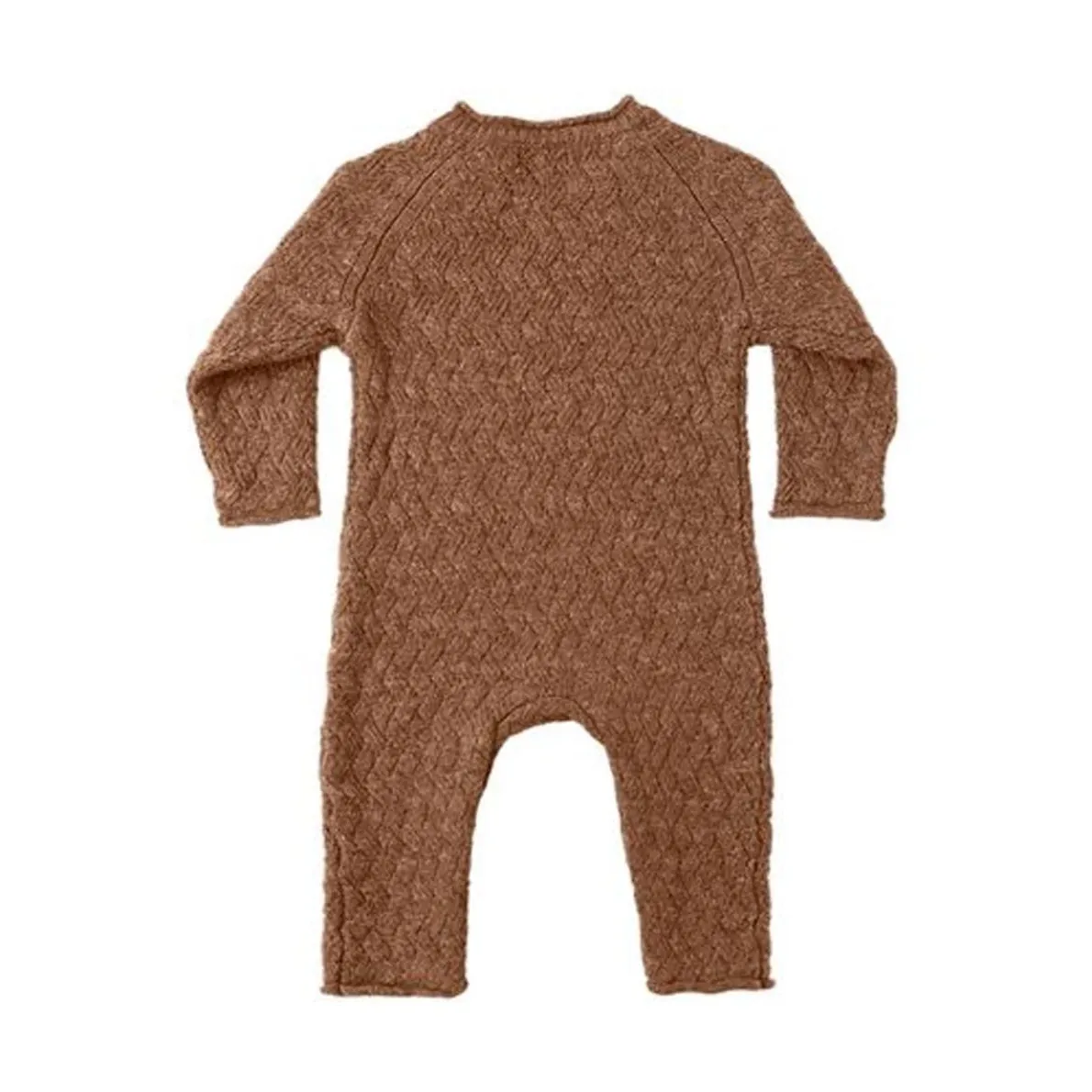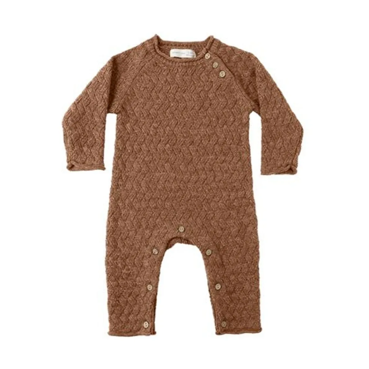 Knit jumpsuit with raglan sleeves and coconut buttons at the neck and inseam, offering a smooth, cozy pullover look.