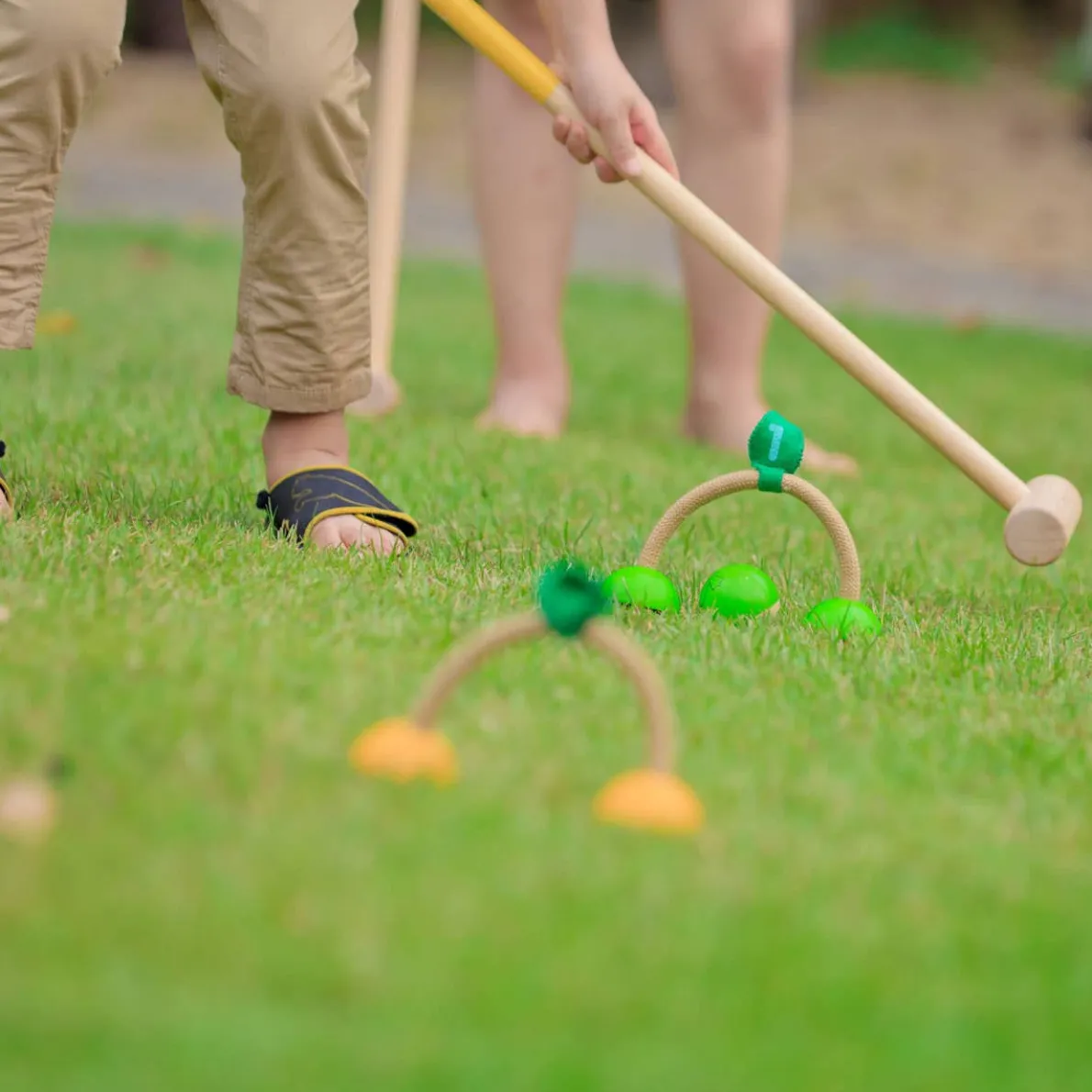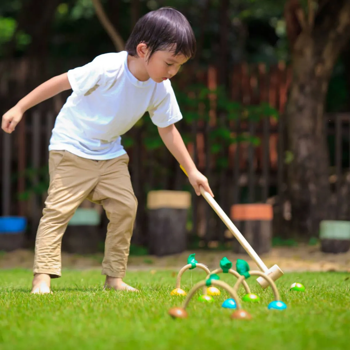 A favorite family game with a very friendly design. The colorful Croquet set can be played in several adjustable settings. The set includes 4 different animal wooden balls – bird, tiger, monkey and frog, 2 mallets, 4 wickets and a final stand.