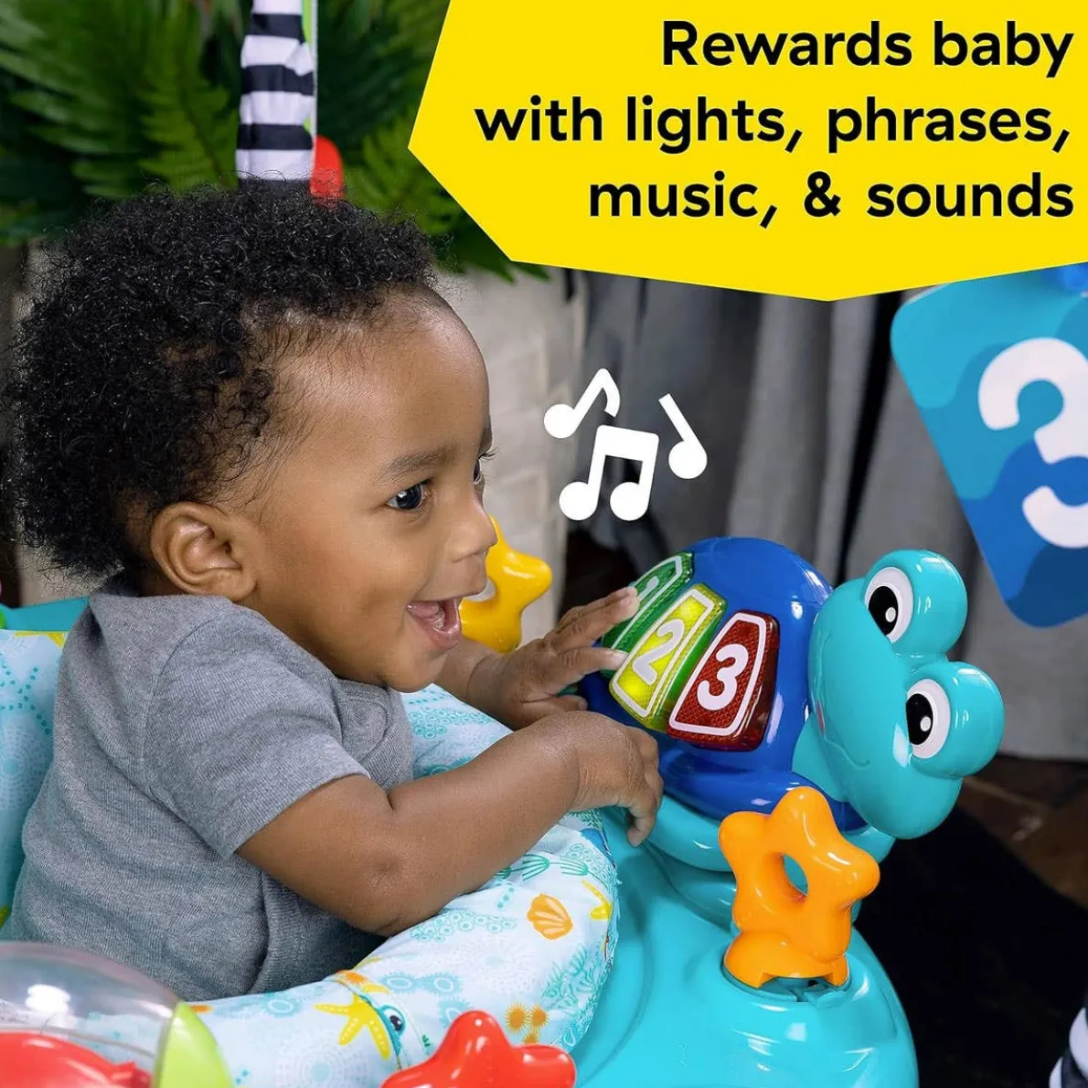 Encourage an ocean of learning with the Baby Einstein Ocean Explorers Curiosity Cove 2-in-1 Activity Jumper. Featuring a seat that rotates 360 degrees, baby can experience the sights and sounds of the ocean from every angle as they jump, explore, and play with this ocean-themed jumper and removable floor toy. 3 modes of play help baby explore melodies, engage the senses, and learn colors & numbers in 4 languages – English, French, German, and Spanish. Songs and lights engage baby as they jump, and the removable electronic Neptune the Turtle toy helps baby dive deep into learning during floor play or on-the-go. 4 heights easily adjust the jumper as baby develops, giving baby a safe and secure space to explore and play from ages 6 months to 1 year, or up to 25 pounds. Machine washable seat pad. Assembled dimensions: 33.5 x 35.1 x 35.1 inches. Requires 3 AA batteries (not included).