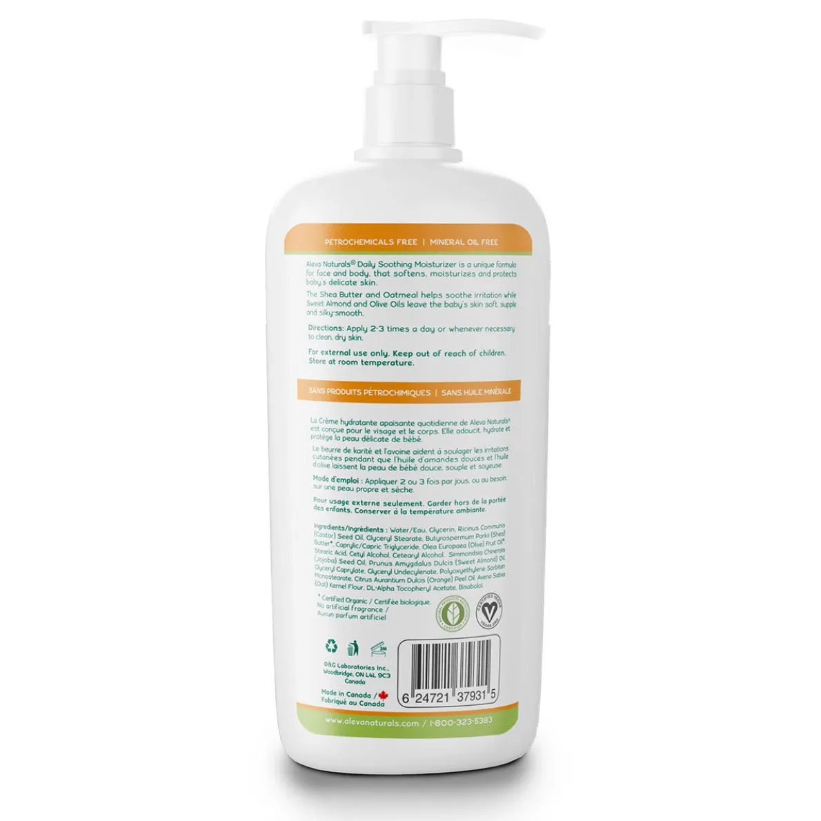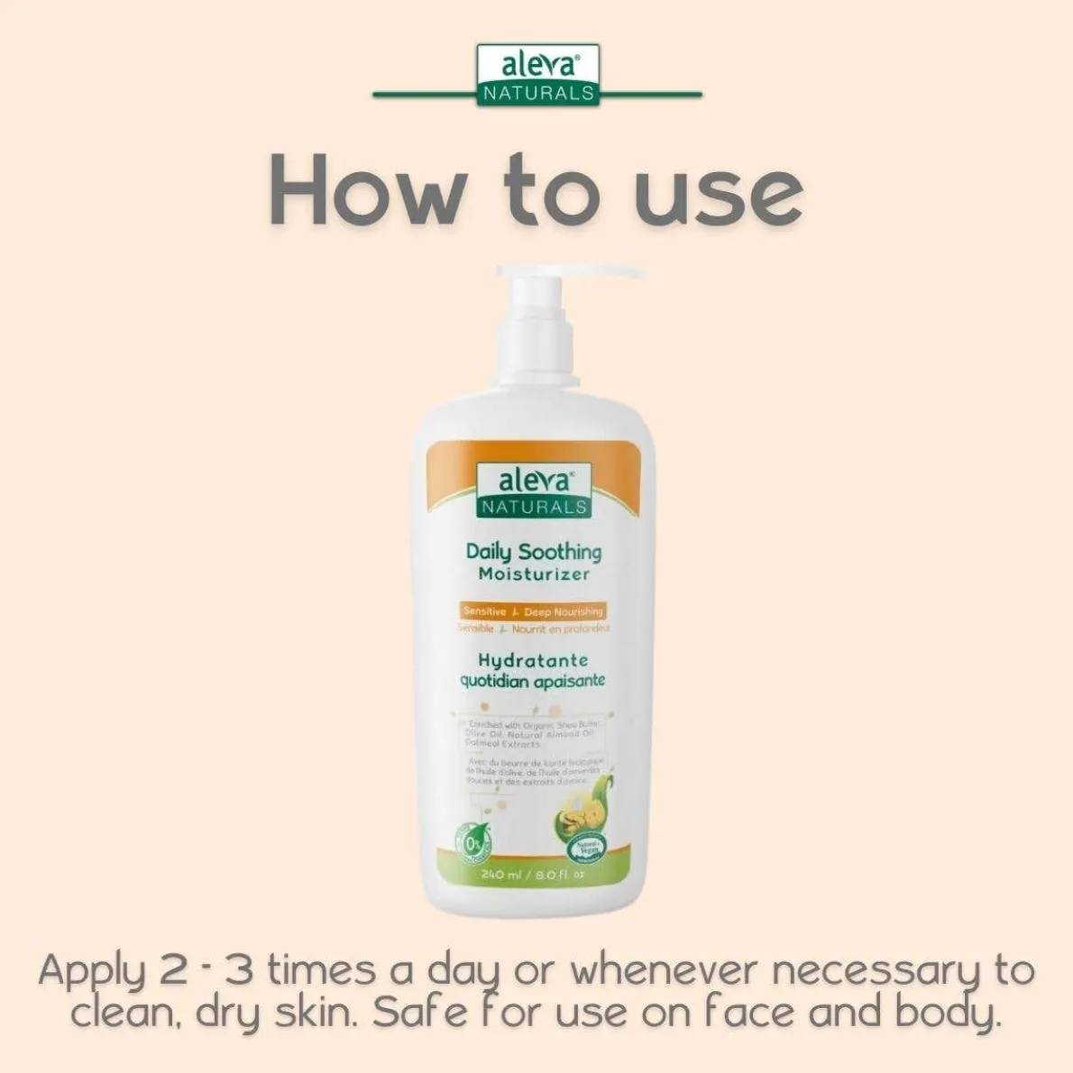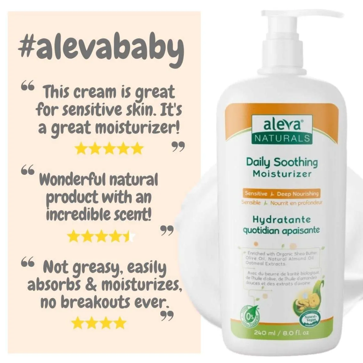 To ease the pain of dry and chapped skin, moisturizing is key. Traditional lotions are water-based and just moisturize the surface of the skin, providing short term results. Aleva Naturals Daily Soothing Moisturizer is an emulsion that penetrates deep within the skin providing deep hydration. This is why our Daily Soothing Moisturizer has long lasting results and allows the skin to breathe while being grease free! With its soothing blend of Oatmeal Extracts, Bisabolol, Jojoba oil and Vitamin E, Daily Soothing Moisturizer helps to reduce redness and dry, chapped skin associated with eczema and other skin maladies. Designed for babies, but effective for the whole family!