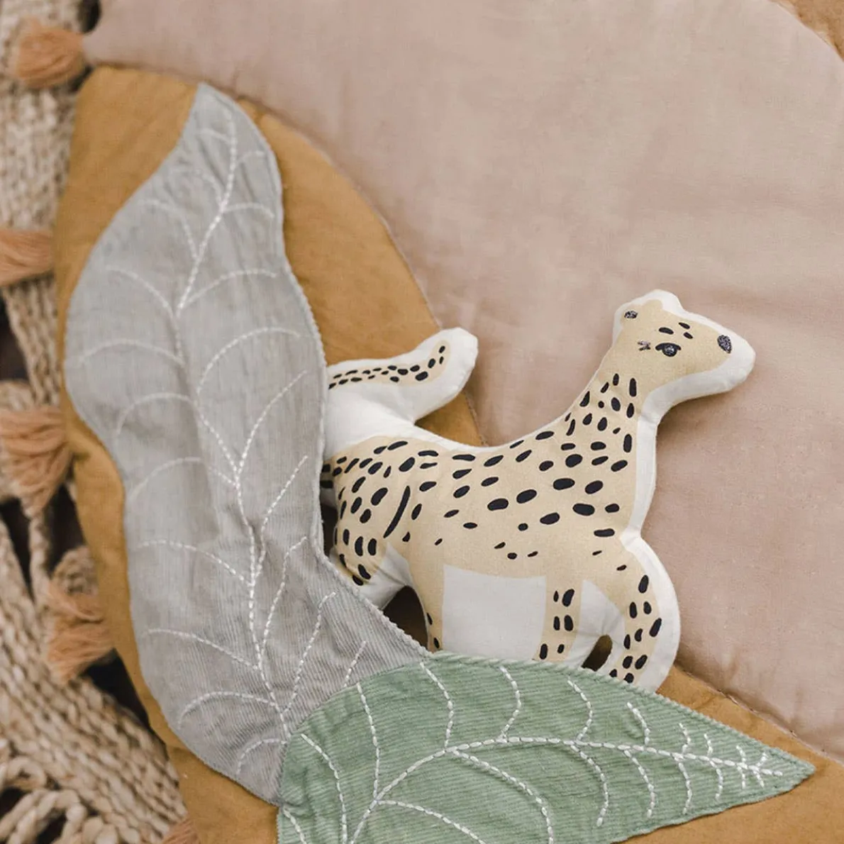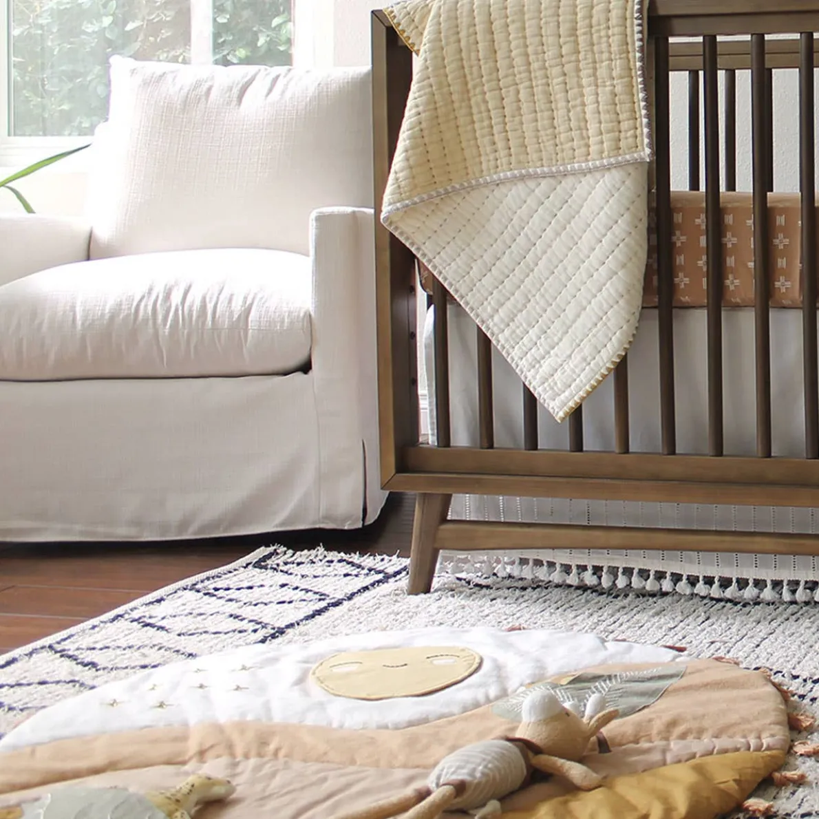 From sunrise to sunset, The Desert Sunset Activity Mat from Crane Baby is the perfect spot to lounge, bond and play with your baby. Featuring several interactive elements to help encourage baby’s natural development including a “sun” mirror that crinkles, “leopard” plush toy that rattles and a “bird” plush toy that chirps when you squeeze the tummy. This adorable playmat is also machine washable and pairs beautifully with several of our baby bedding sets and nursery wall art for a curated nursery look.