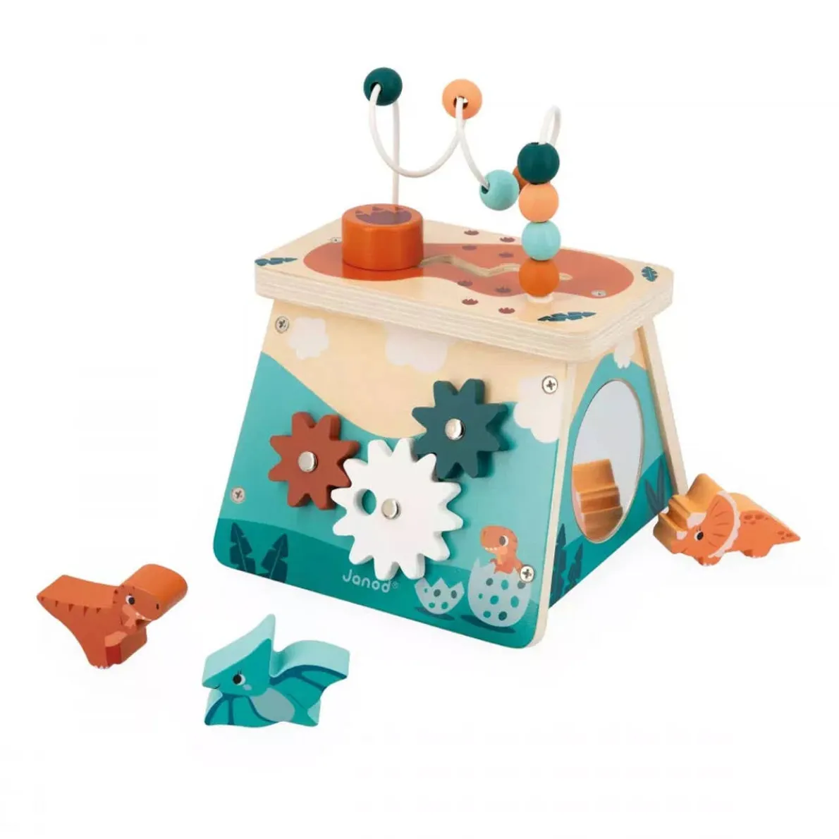 What a pretty dinosaur-themed shape-sorting box! You’re bound to love the colours and details found on this easily transportable play cube. This multi-activity volcano boasts multiple games that will appeal to children aged 12 months and up. The front features a shape sorter with wooden dinosaurs to slot through the correct holes. Toddlers will need to scratch their brains to figure out where to place the cute Tyrannosaurus, Triceratops and Pteranodon! The dinosaurs won’t make any noise when they drop, thanks to the felt at the bottom of the box. Then plunge your hand into the side to retrieve all the wooden pieces. The back boasts 3 gears that will introduce little ones to the world of rotation and speed, whilst also developing their dexterity. On the left side, baby will have fun starring at their reflection in a mirror, while there are 2 other games on the top of the volcano: a maze and an abacus with 8 wooden beads. This beautiful early-learning toy is made from FSC® wood.