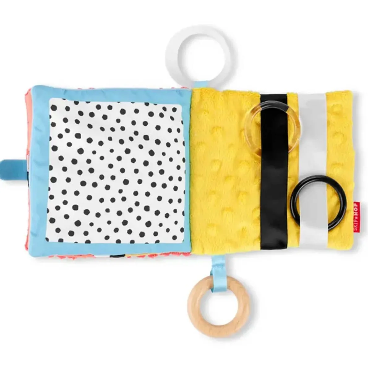 Designed to encourage sensory exploration at playtime, Skip Hop’s Montessori-inspired soft activity book for baby includes multiple textures little hands will love to touch and discover (every page makes crinkle sounds)! Featuring a high contrast black & white palette with pops of primary colors for visual stimulation, we also included a baby mirror, a smooth wooden teething ring, plus more activities for learn and grow fun.