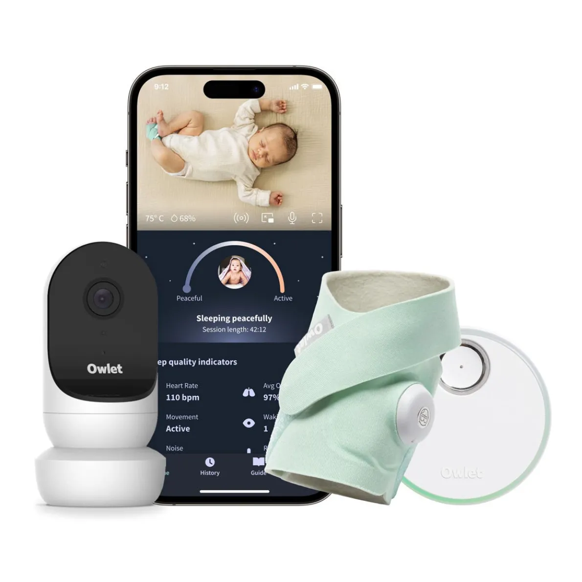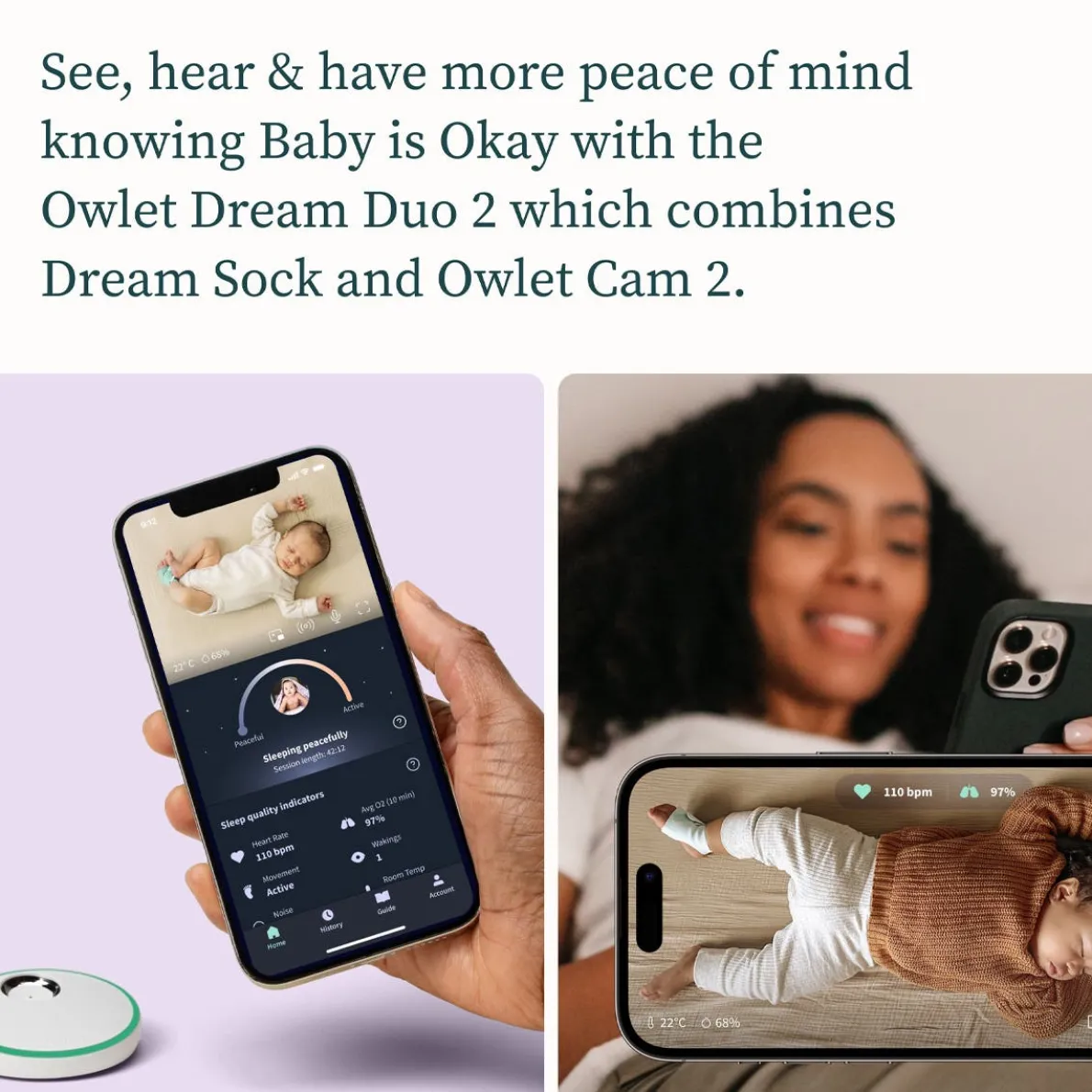 Know when Baby may need you with Owlet most advanced monitoring system yet. The NEW Dream Duo combines the Dream Sock and Cam 2 and is the only baby monitor to track heart rate and historic oxygen* as Sleep Quality Indicators—all while streaming HD video right to your phone.