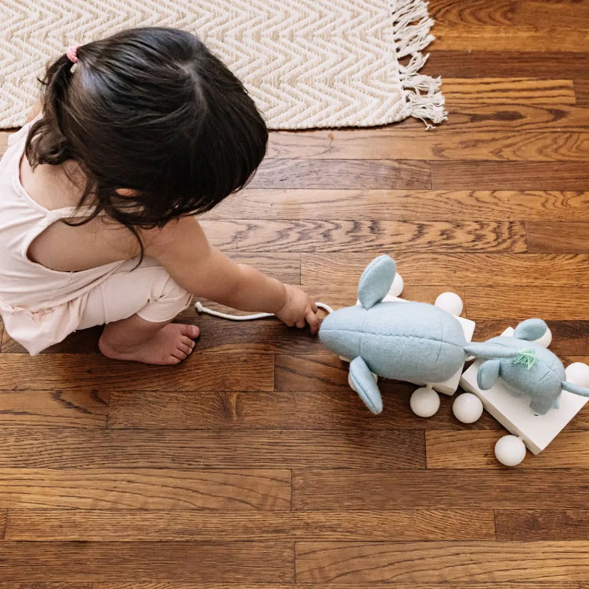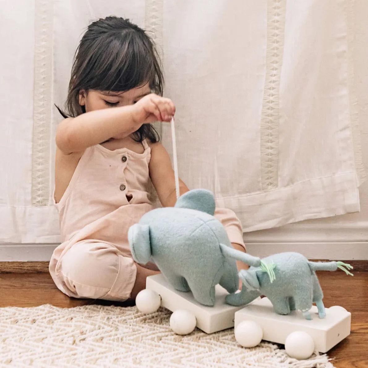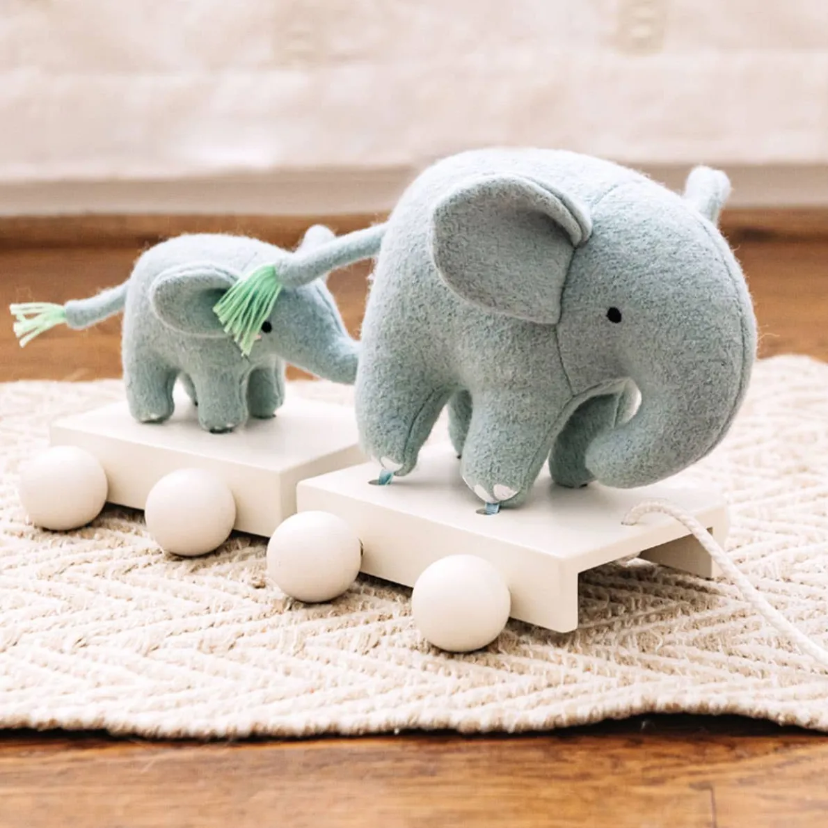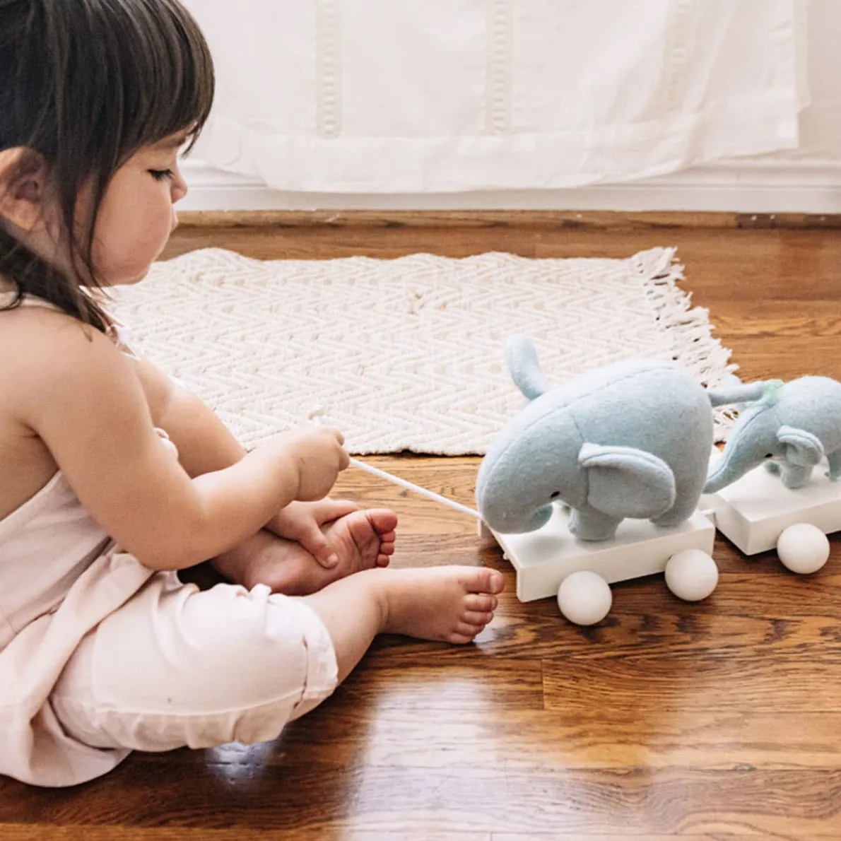 Your toddler will love the push and pull of Elephant Pull Toy. This sweet fleece mama and baby elephant sit atop an mdf base, and can be easily detached for independent play. Perfect play for baby on the go.