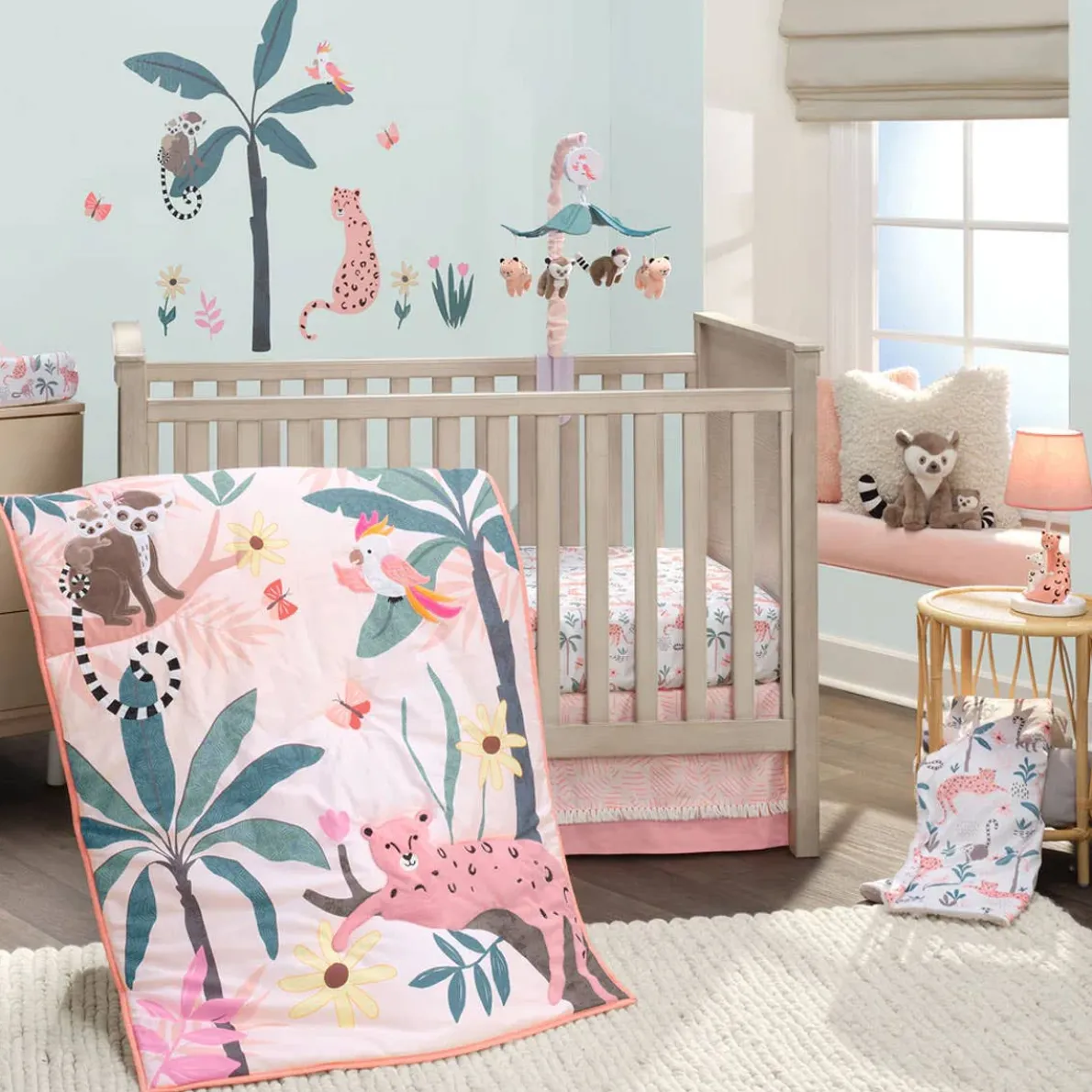 A soft pink velour center is perfect for changing your little one. The elastic side panels are cotton in an adorable jungle safari print with leopards, lemurs, trees, bushes, butterflies, and flowers. There are buttonholes for the changing pad straps so your little one is safe and secure while getting their diaper changed. Machine washable for easy care.