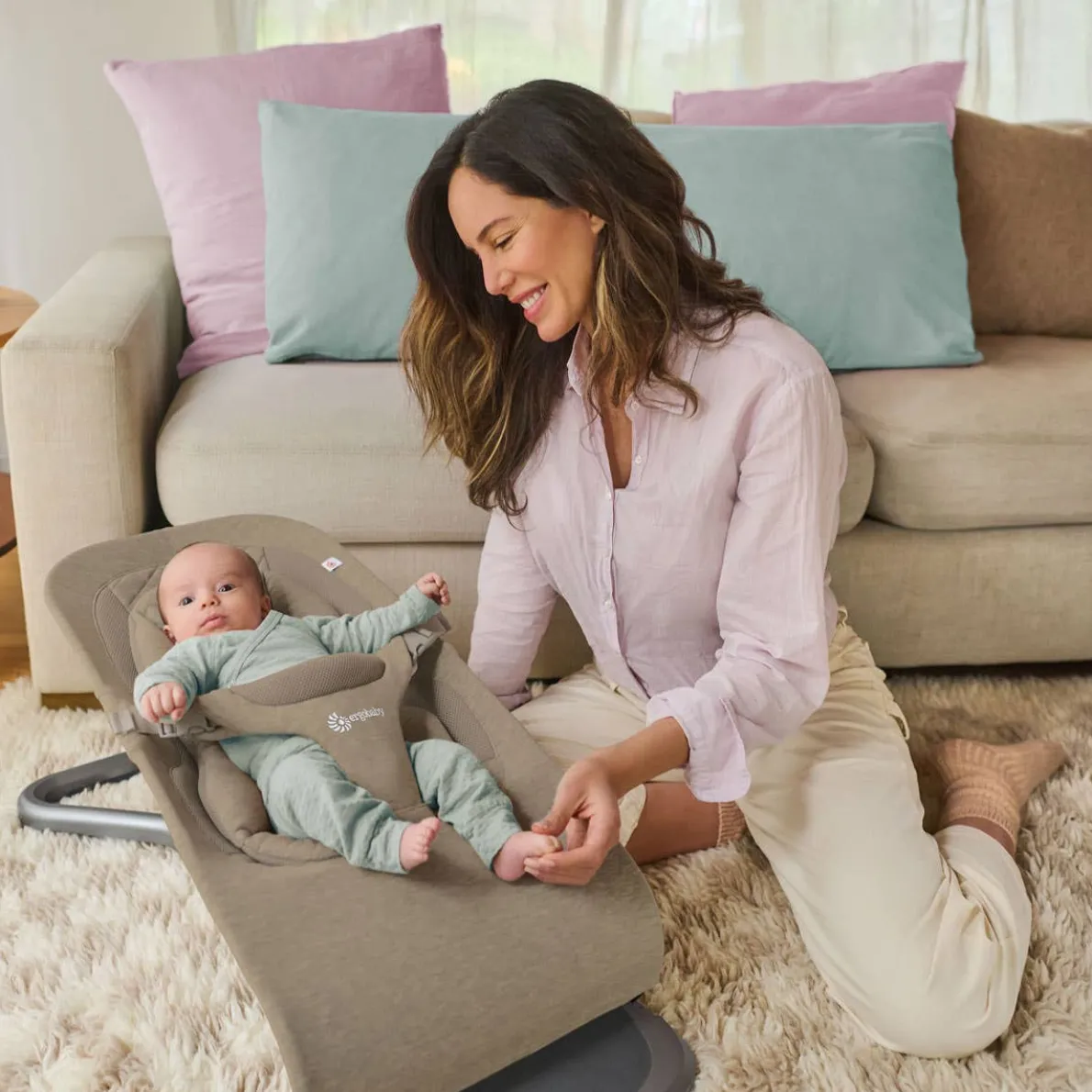 The Ergobaby Evolve Bouncer uses natural rocking technology—so no plugs, batteries, or switches needed. Plus, that means it’s lightweight and easy to move from room to room.