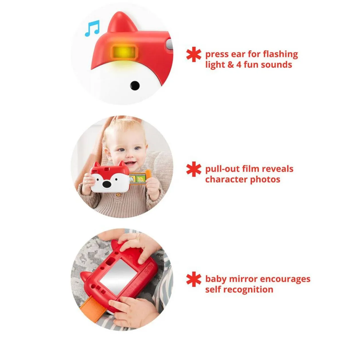 One, two, three…say “cheese!” Our friendly fox camera is loaded with fun “film,” realistic shutter sounds, flash bulb lights, a baby mirror and more awesome features little shutter bugs will love! Just press the fox’s ear to get the photo shoot rolling!