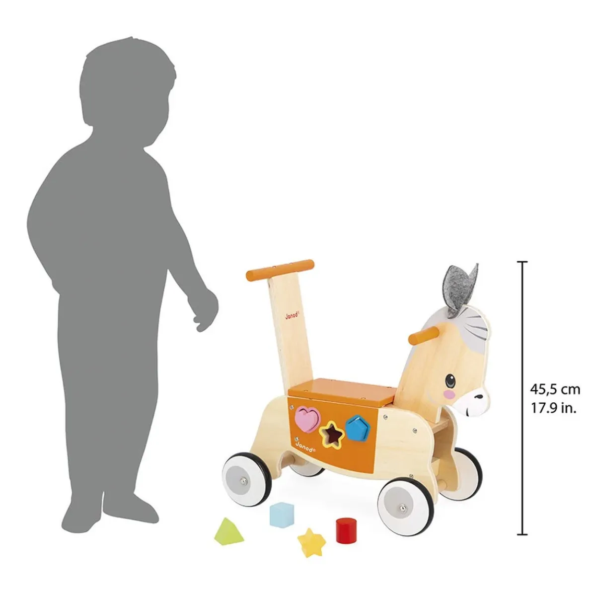 Little donkey can’t wait to discover the world, and neither can baby! With this wooden donkey carrier, you’re on your way to new adventures, from 12 months. Come on, hu! By riding his carrier, baby develops his sense of balance and gross motor skills, while discovering his environment. Want to push your toy or be pushed? Thanks to the handle on the back! Whichever way your little one uses his carrier, he’ll learn to manage his weight and have a great time. The little extra for this early-learning toy? The shape box included, with 6 shapes to insert and retrieve from the front, so you can start all over again. Perfect for practising dexterity! Last but not least, the 4 rubber wheels are quiet and provide a good grip, so you can walk around in complete peace of mind. Ideal for encouraging gross motor skills and strengthening support for walking, this wooden carrier is a real eye-catcher, with its little felt ears and soft colors. Whether your little one loves farm animals or simply trotting, he’ll be delighted! This early-learning toy is made from FSC™-certified wood from sustainably managed forests.