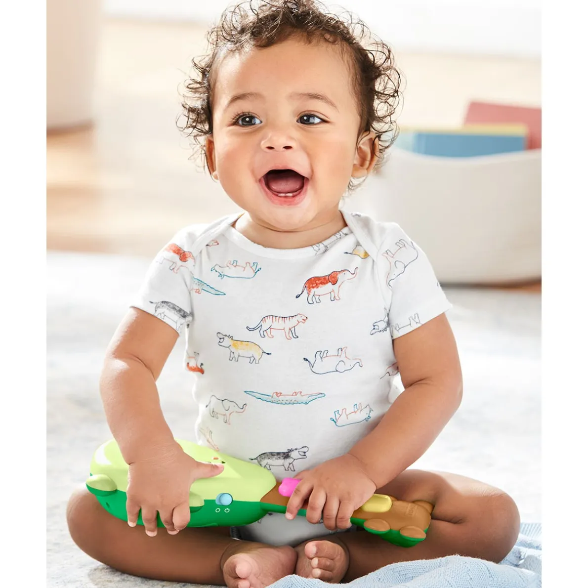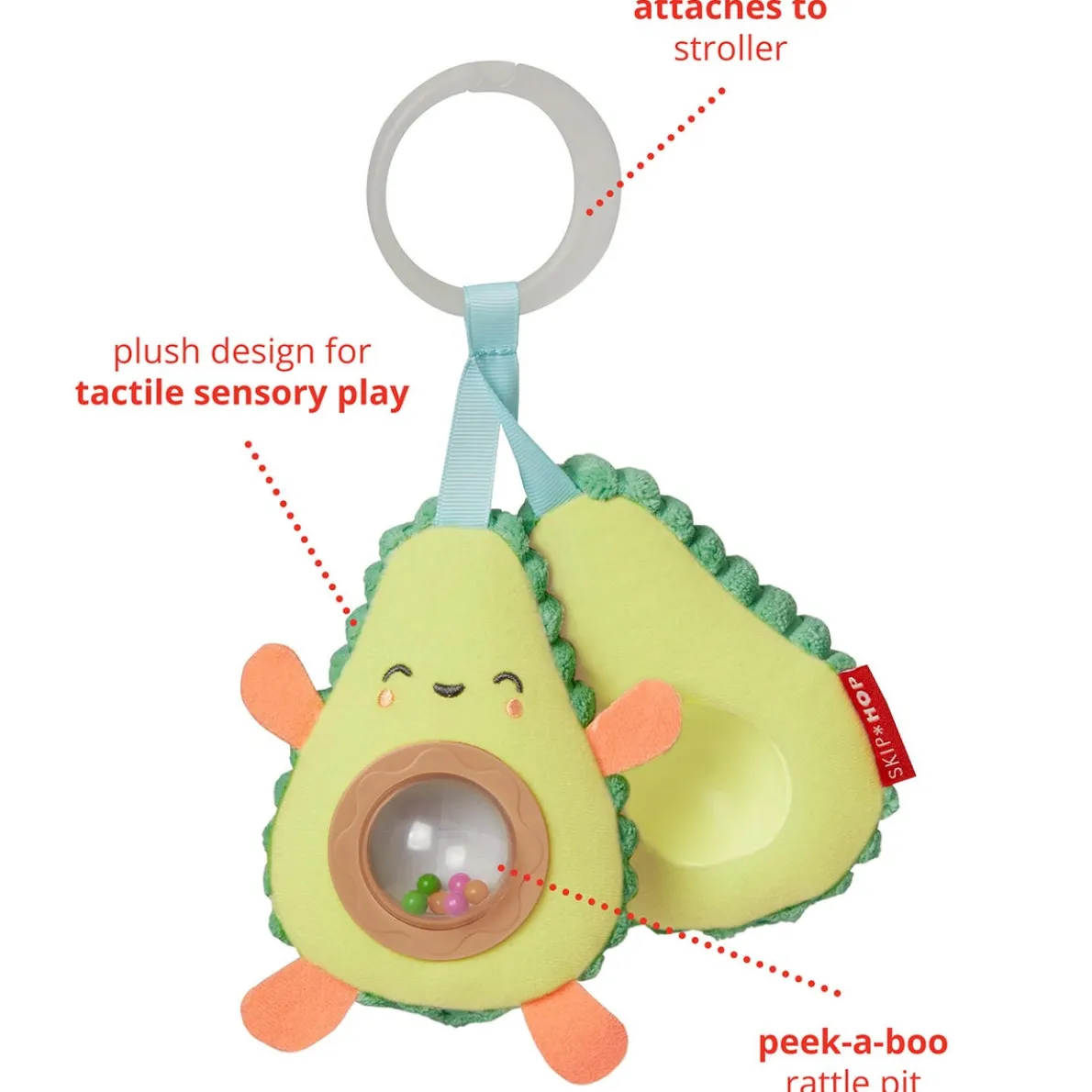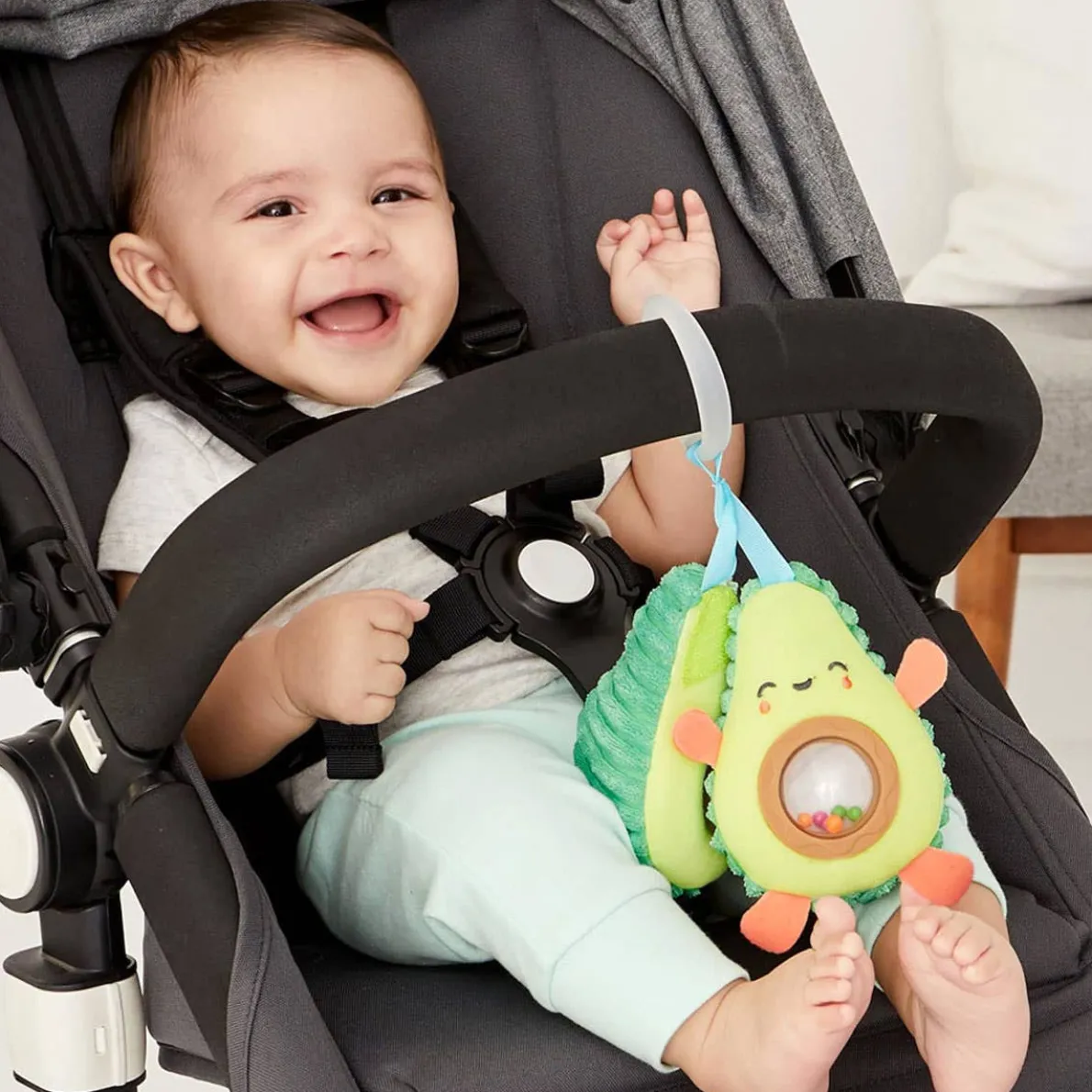 Get ready to guac and roll with this adorable avocado stroller toy. Featuring two halves that stick together, it’s easy for little hands to open and close. Inside, they’ll find (surprise!) a peek-a-boo rattle “pit” at the center. The plush, textured exterior and cute felt details make this a fresh and fun way to entertain baby wherever you go. Like all our stroller toys and portable baby toys, it has a built-in loop and ring so you can easily attach it to the bar of your stroller, infant carrier or other gear.