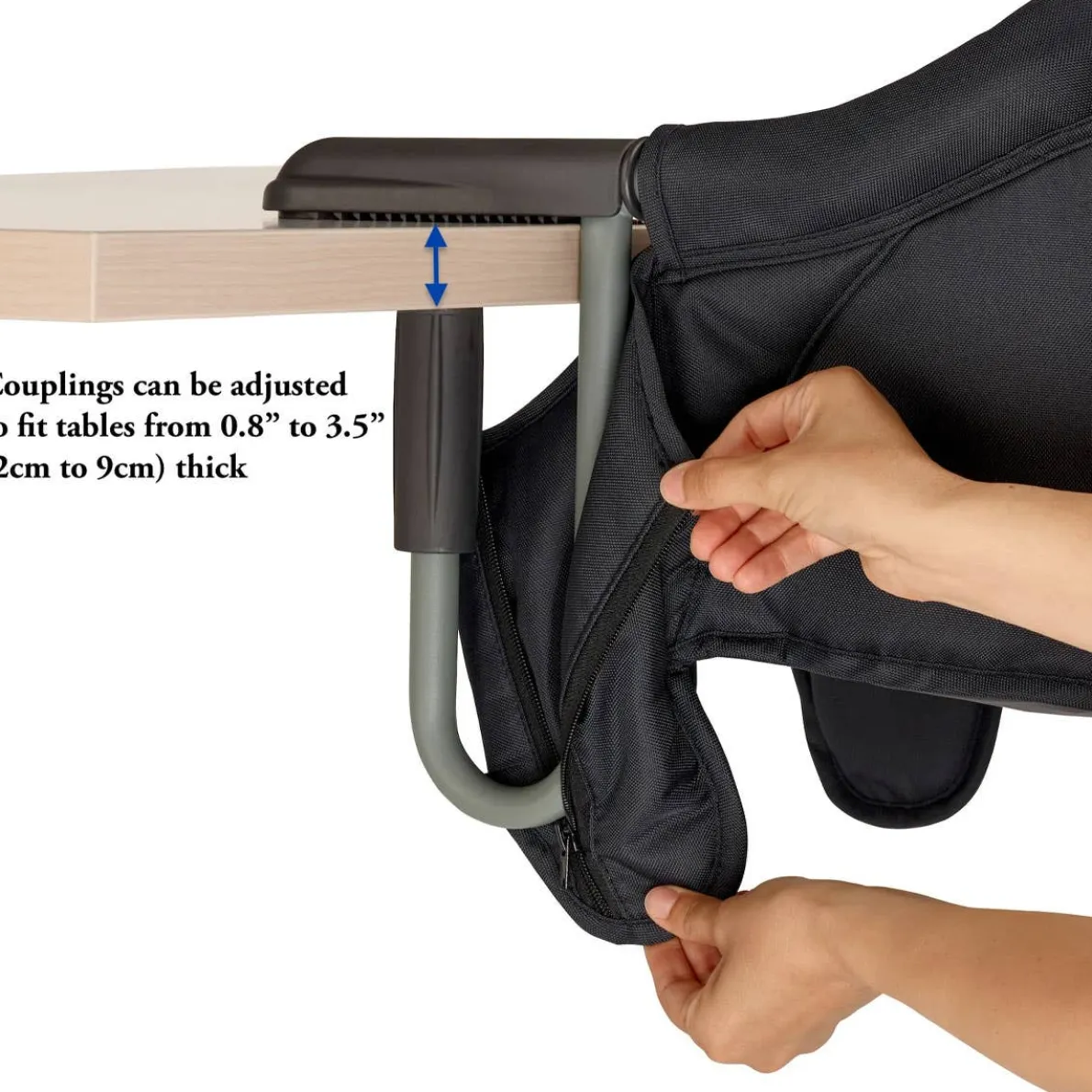 - Parents love the Fast because of its simple, twist-tight couplings and its compatibility with most types of tables (leaving them scratch-free): from 0.8″ to 3.5″ thick (from 20mm to 90mm). If the table has a skirt underneath, the skirt must be at least 3.25″ (83mm) from the edge of the table, so that the Fast table chair arms can be pushed all the way in.