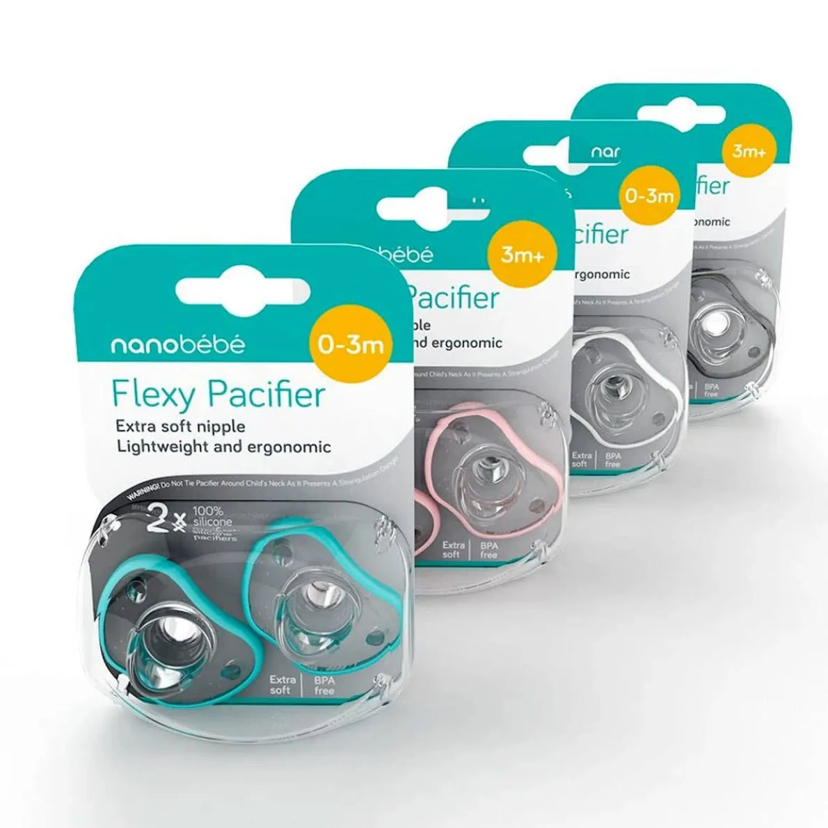 Nanobébé’s Flexy pacifier will calm and soothe your newborn from their very first day. Flexy pacifiers are made from safe BPA-free silicone. This pacifier is both durable and extra soft – and thanks to its lightweight and ergonomic design; it will easily stay in your baby’s tiny mouth. The one-piece construction meets the standards of the American Academy of Pediatrics Guidelines. Its unique nipple shape promotes healthy oral development and discourages nipple confusion when breastfeeding. Choose from four distinctive frame colors.