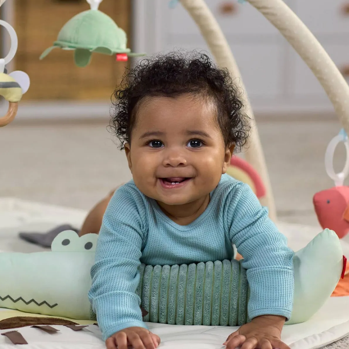 Introduce baby to animals, shapes and more learn and grow fun at playtime! Our cute and comfy baby play gym encourages multi-sensory exploration through touch, sight and sound plus over 17 skill-building developmental activities. The baby play mat, tummy time crocodile and removable hanging toys encourage motor skills, tactile recognition, grasping, teething and more engaging ways for baby to play. Use it for overhead play, seated play or as a tummy time mat—our activity gym is thoughtfully designed to inspire baby to explore, discover and develop new skills.
