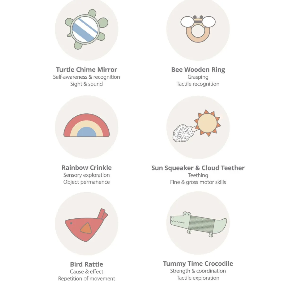 - Tummy time crocodile; 5 Hanging Toys: Bee wooden ring, Sun squeaker with cloud teether, Turtle chime mirror, Rainbow crinkle, Bird rattle