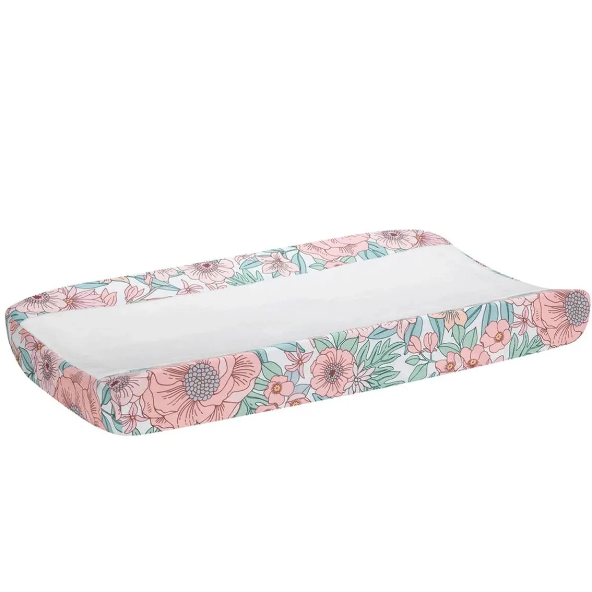 A soft white luxurious coral fleece center is perfect for changing your little one. The side panels are a beautiful watercolor liberty floral print in 100% cotton. There are buttonholes for the changing pad straps so your little one is safe and secure while getting their diaper changed. It is machine washable for easy care.