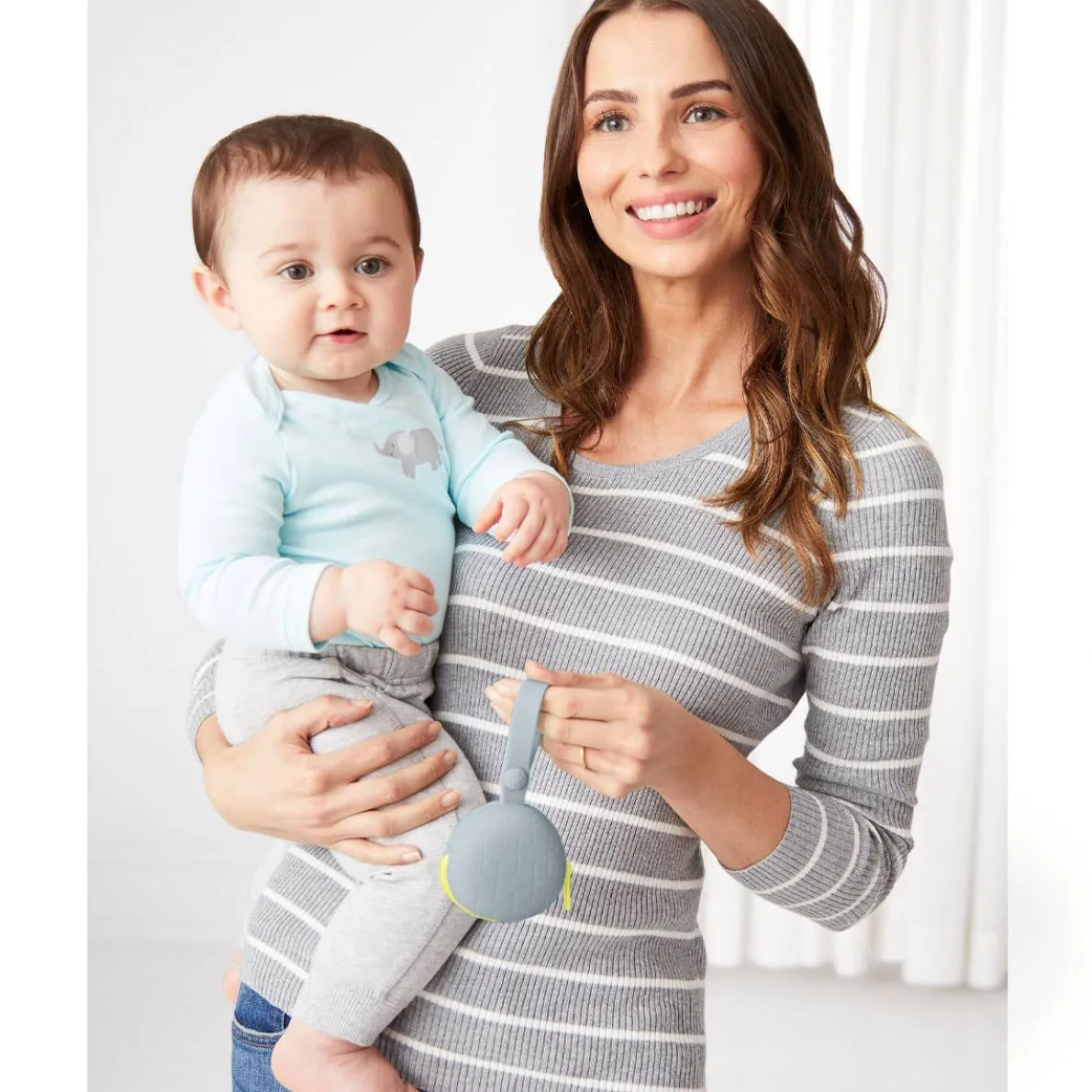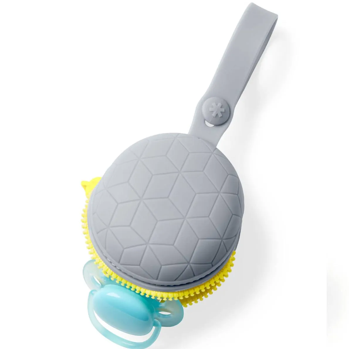 With a secure zip closure and a modern compact shape, Skip Hop’s silicone pacifier holder keeps pacis clean and ready to go. Designed to fit up to two pacifiers, the soft silicone material is dishwasher safe so it’s easy to clean. A handy strap attaches to your stroller or diaper bag so baby’s pacifier is always within easy reach.