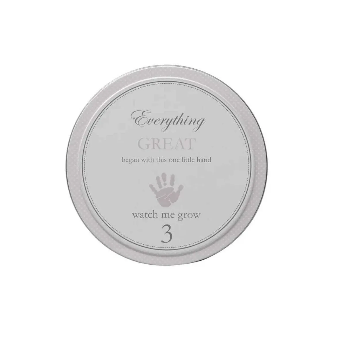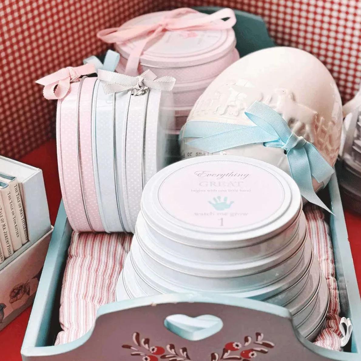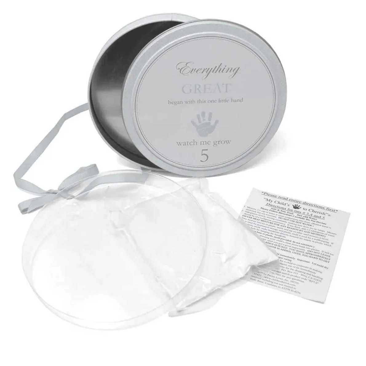 The handprint in the tins are the original handprint kits made with plaster, just add water. 4 inch to 6 inch tins to make your child’s handprint from ages 1-5 years old.